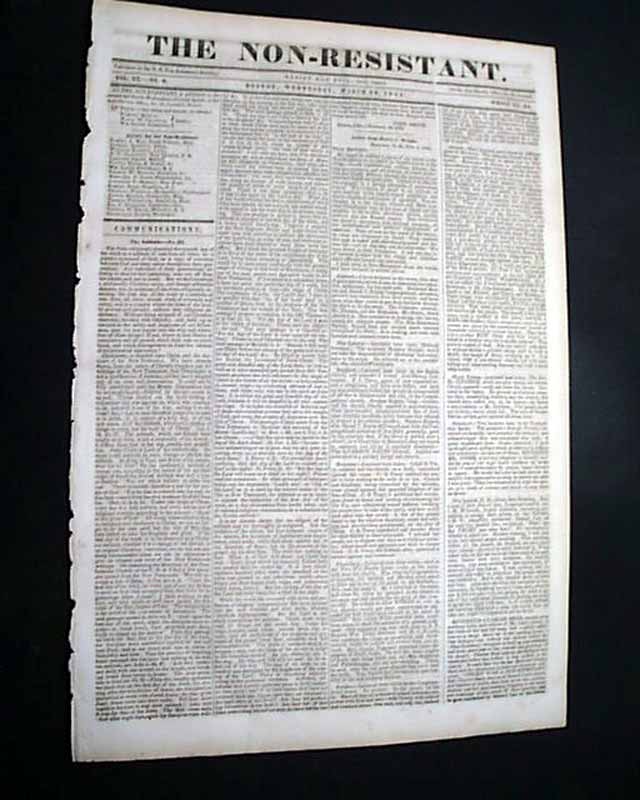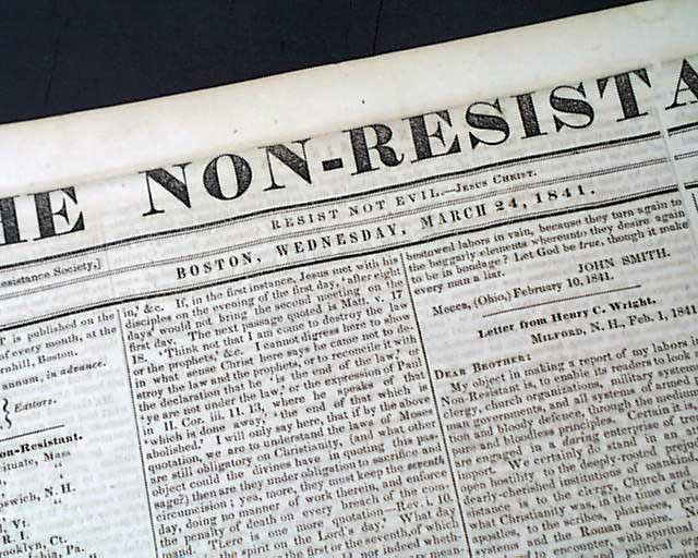 As Wikipedia notes: "The New England Non-Resistance Society was an American peace group founded by William Lloyd Garrison (publisher of the famous 'Liberator' newspaper) in 1838. At the organizing convention, members of the American Anti-Slavery Society & the American Peace Society expressed discomfort with Garrison's philosophy 'of non-resistance & inclusion of women in public political activities. After conservative attendees opposing Garrison walked out of the convention in protest, those remaining formed the 'New England Non-Resistance Society'.