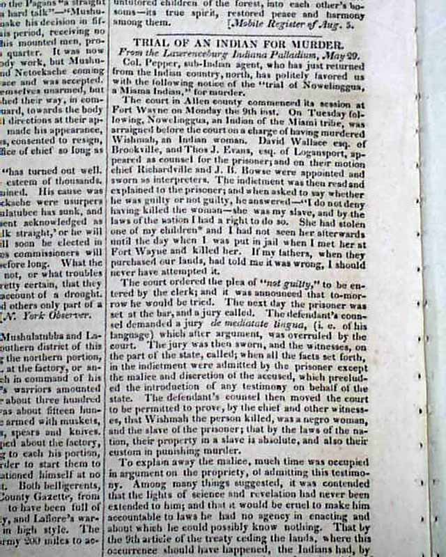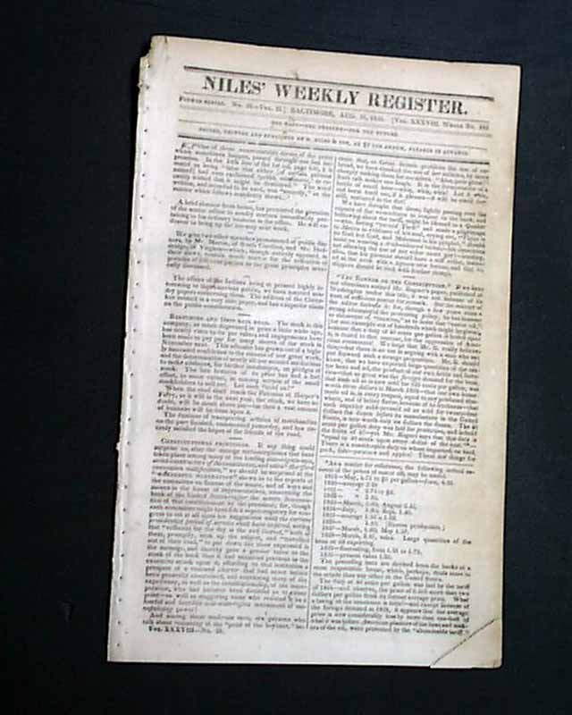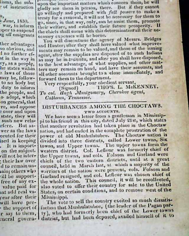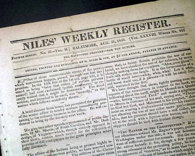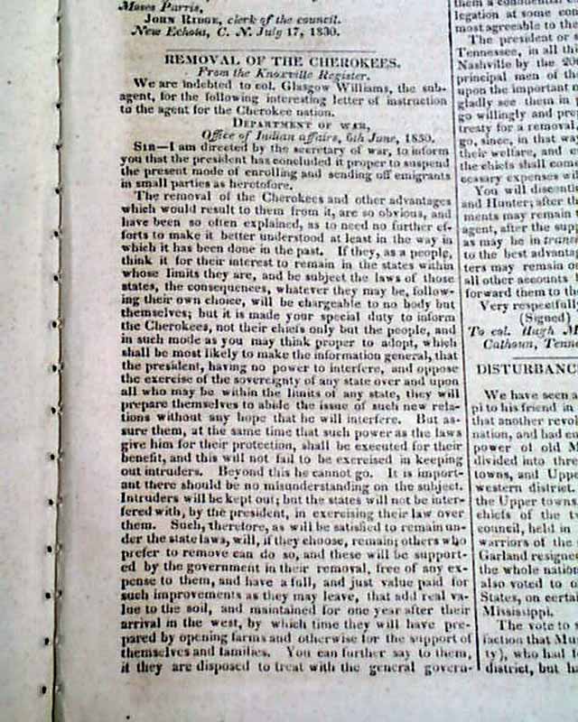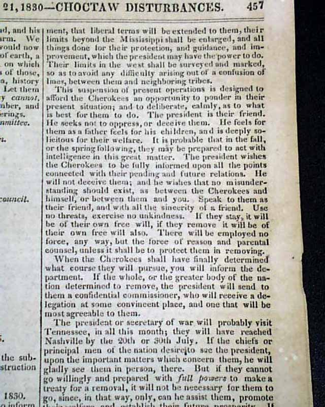 NILES' WEEKLY REGISTER, Baltimore, Aug. 21, 1830 Near the back is: "Removal of the Cherokees" which is a follow-up to the Indian Removal Act signed by the President 3 months prior. The lengthy letter from the "Department of War, Office of Indian Affairs" explains the benefits of the Indians being removed to west of the Mississippi and the dangers of staying where they are. Ultimately this controversial Act would result in the Trail of Tears.