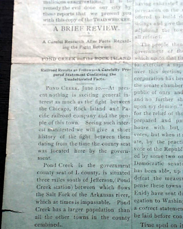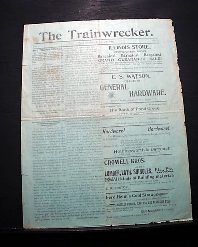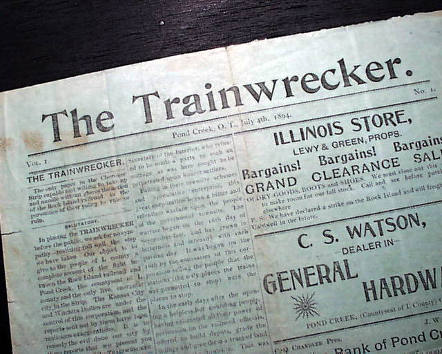 THE TRAINWRECKER, Pond Creek, Oklahoma Territory, July 4, 1894 Not just rare, this could be a unique issue being the volume 1, number 1 issue of a newspaper about which nothing can be found. It is not listed in Gregory's "Union List of Newspapers".