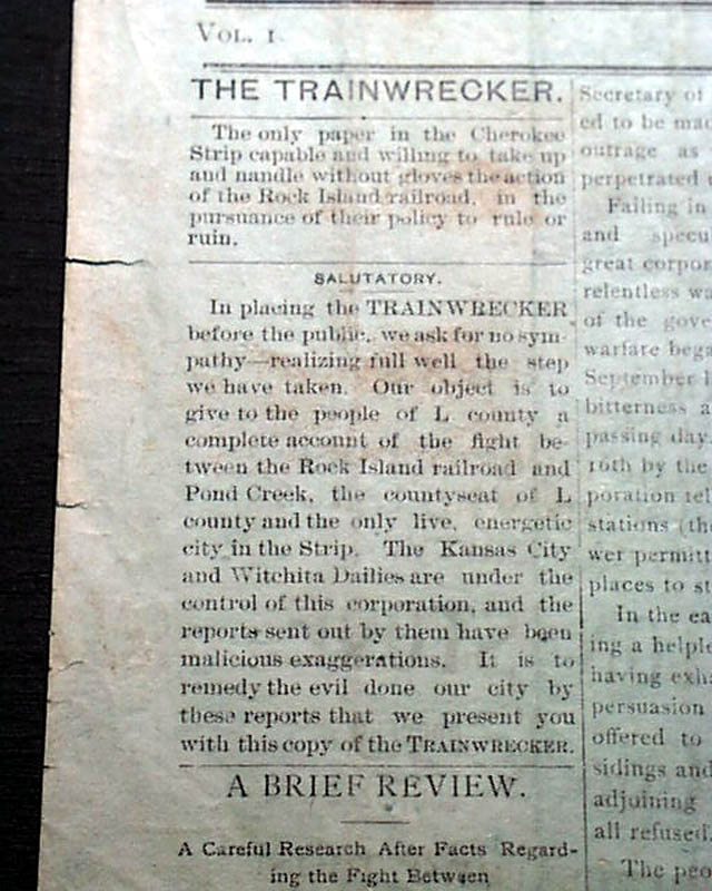 Then the "Salutary" which begins: "In placing the TRAINWRECKER before the public, we ask for no sympathy--realizing full well the step we have taken. Our object is to give to the people of L county a complete account of the fight between the Rock Island railroad and Pond Creek, the county seat of L county and the only live, energetic city in the Strip..." with much more not just on the front page but on inside pages as well.