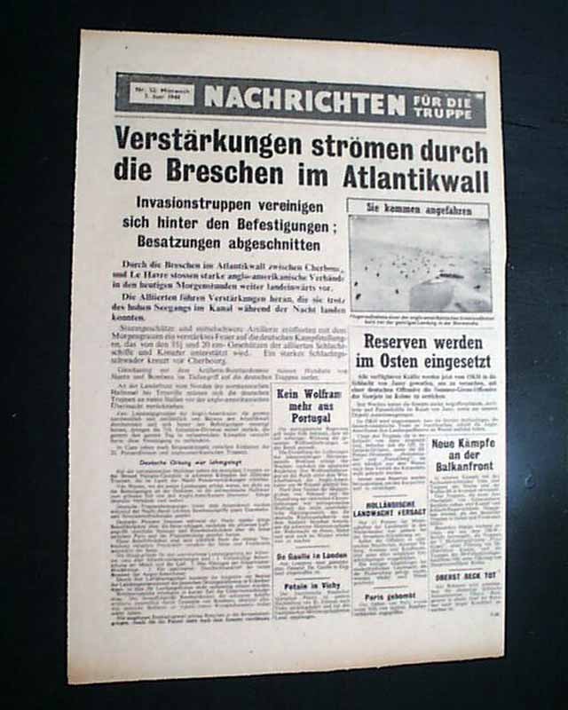 This newspaper/leaflet was created to counter Goebbels' propaganda machine. Notice this issue is from the day after D-Day with a photo of the invasion. The headline translates to: "Reinforcements Stream Through the Breaches in the Atlantic Wall" and: "Invasion Forces Unite Behind The Fortifications; Crews Cut Off'.