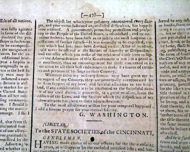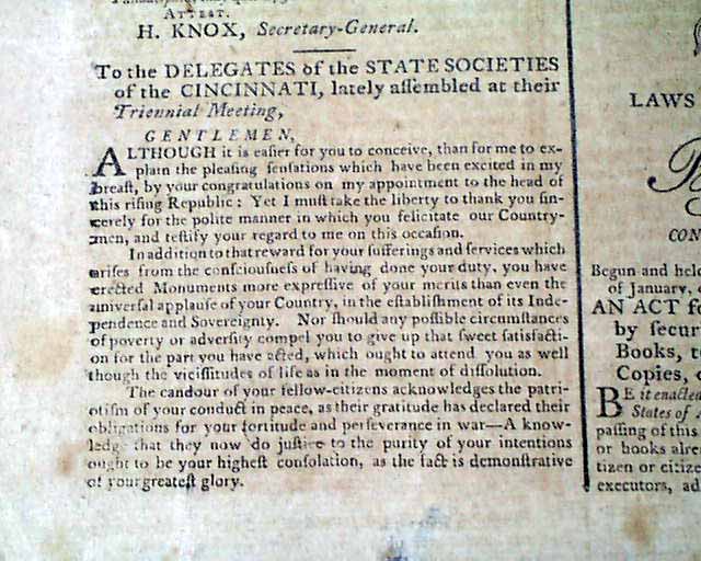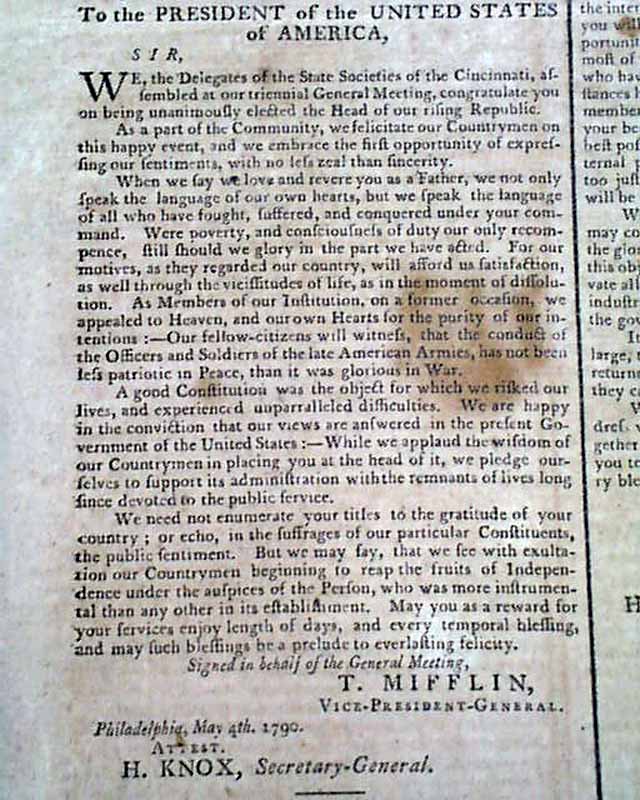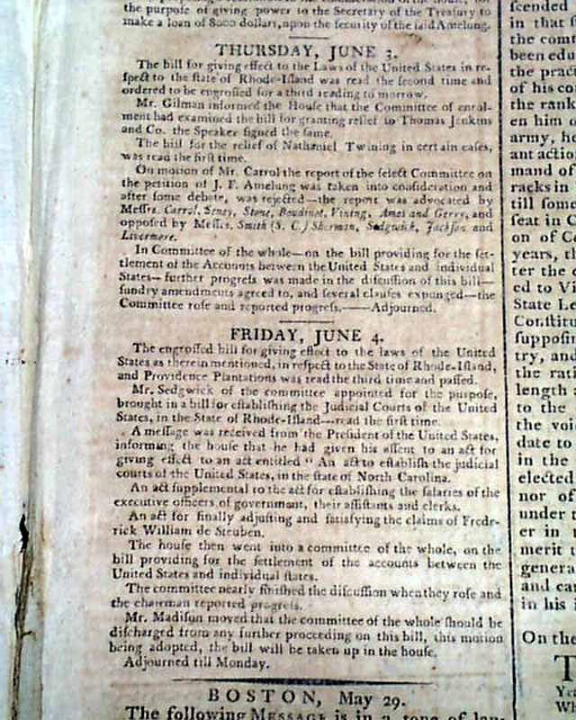Page 2 also has another letter signed in type: G. Washington, being his reply to the letter sent by the delegates of the state societies of the Cincinnati congratulating him on being elected President. Many reports from Congress including: "...a bill for establishing the permanent seat of the federal government was read a second time..." and also mention that "...The bill for giving effect to the laws of the United States in respect to the state of Rhode Island...was read the third time and passed...". Rhode Island had just recently become the last of the 13 original colonies to ratify the Constitution.