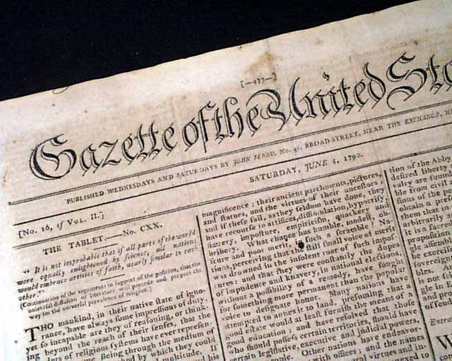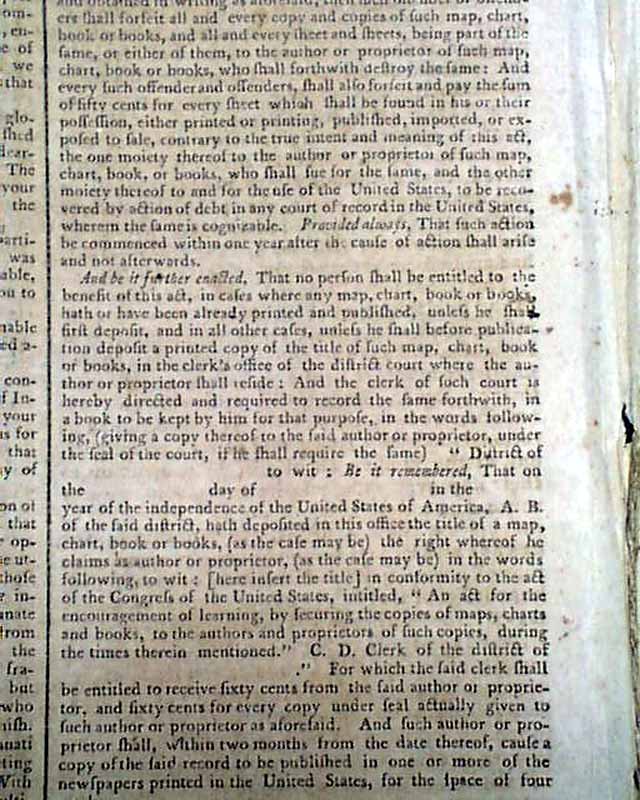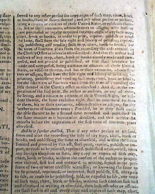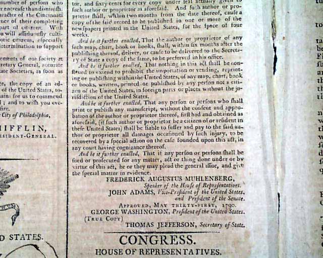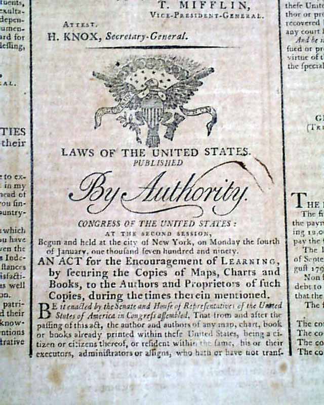 GAZETTE OF THE UNITED STATES, New York, June 5, 1790 A very significant issue for anyone in the publishing field, as page two has virtually an entire column taken up with the printing of: "An Act for the Encouragement of Learning, by securing the Copies of Maps, Charts and Books to the Authors & Proprietors of such Copies, during the times therein mentioned." which was the copyright act, signed in type: George Washington as President, as well as by Thomas Jefferson and John Adams.