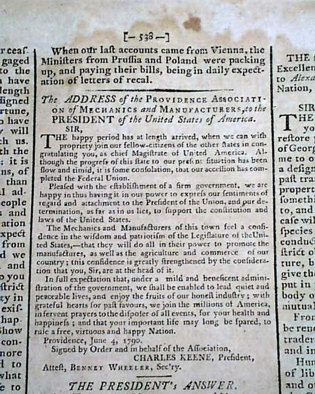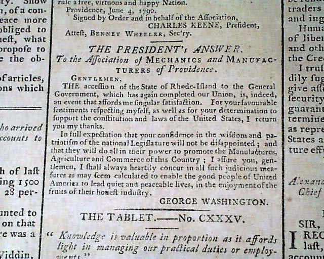 GAZETTE OF THE UNITED STATES, New York, July 28, 1790 Page 2 contains an "Address of the Providence Assoc. of Merchants to the President..." with "The President's Answer" signed by him in type: George Washington.