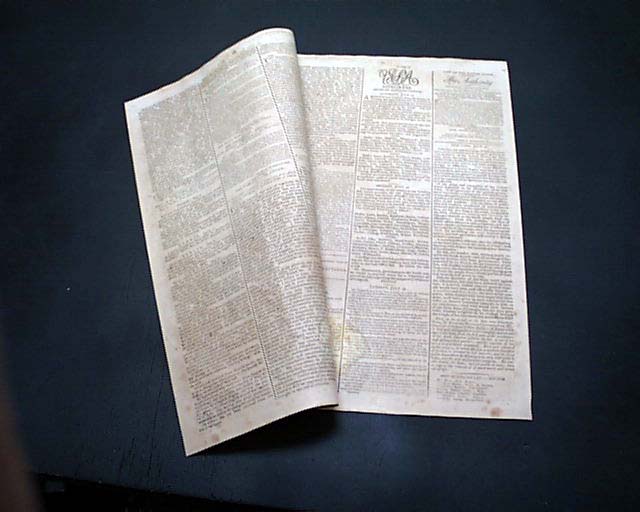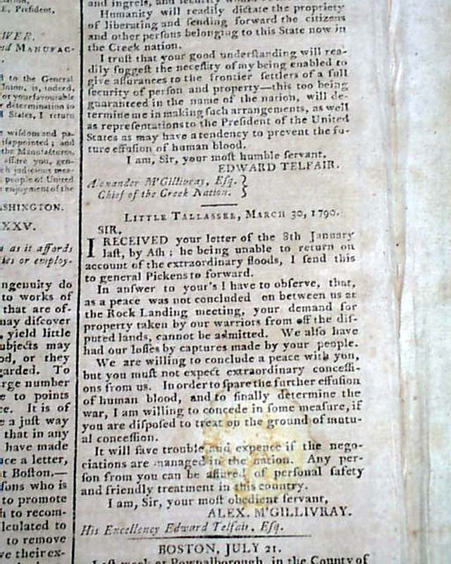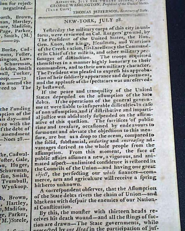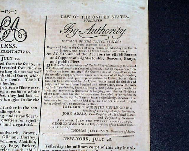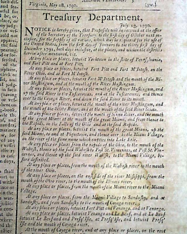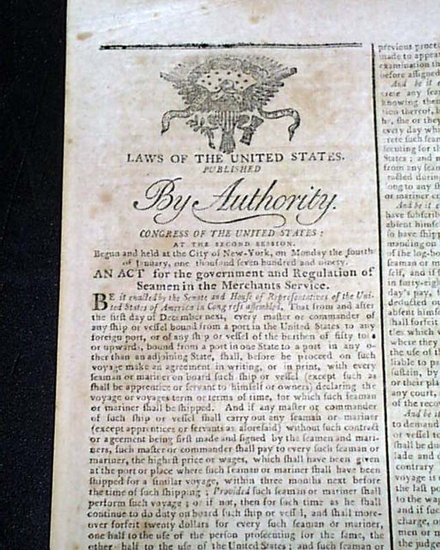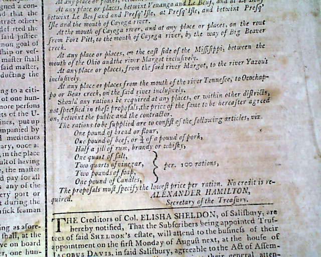 Fully two-thirds of the back page is taken up with an Act of Congress for regulating the seamen in the merchant service, signed in type by George Washington, Thomas Jefferson and John Adams. Also a report headed: "Treasury Department" concerning requesting bids for the supply of rations to the noted military installations, signed by the Sec. of the Treasury: Alexander Hamilton.
