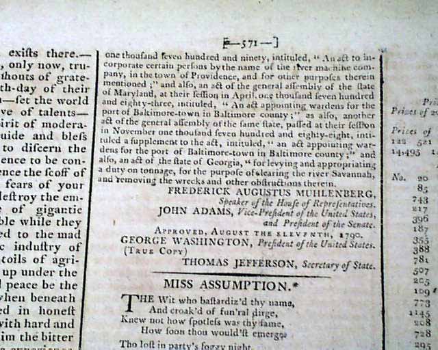 Page 3 contains "An Act Authorizing the Secretary of the Treasury to finish the Light House on Portland Head in the District of Maine" which is signed in type by George Washington, John Adams, and Thomas Jefferson, and headed with a nice engraving of a heraldic eagle. This is followed by yet another Act of Congress signed by the same 3 men--the first three Presidents of the United States.