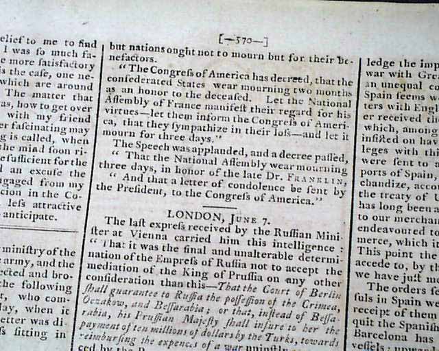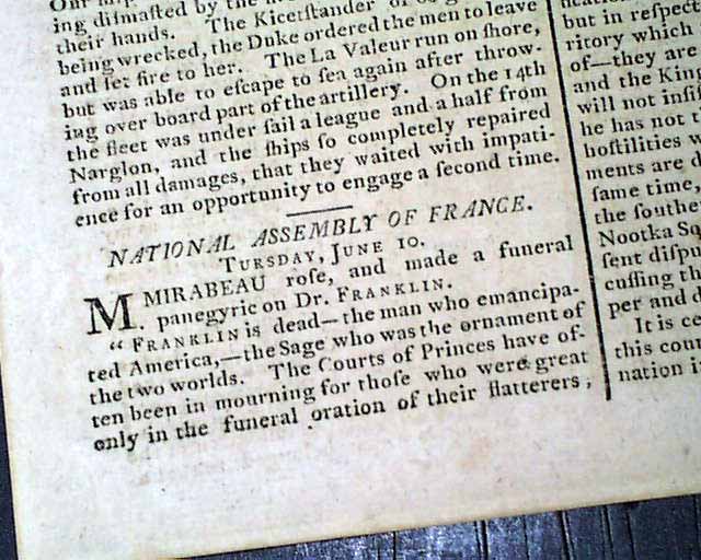 GAZETTE OF THE UNITED STATES, New York, Aug. 25, 1790 Page 2 has an item from the National Assembly of France which begins: "M. Mirabeau rose, & made a funeral panegyric on Dr. Franklin. 'Franklin is dead--the man who emancipated America--the Sage who was the ornament of the two worlds..." with more.