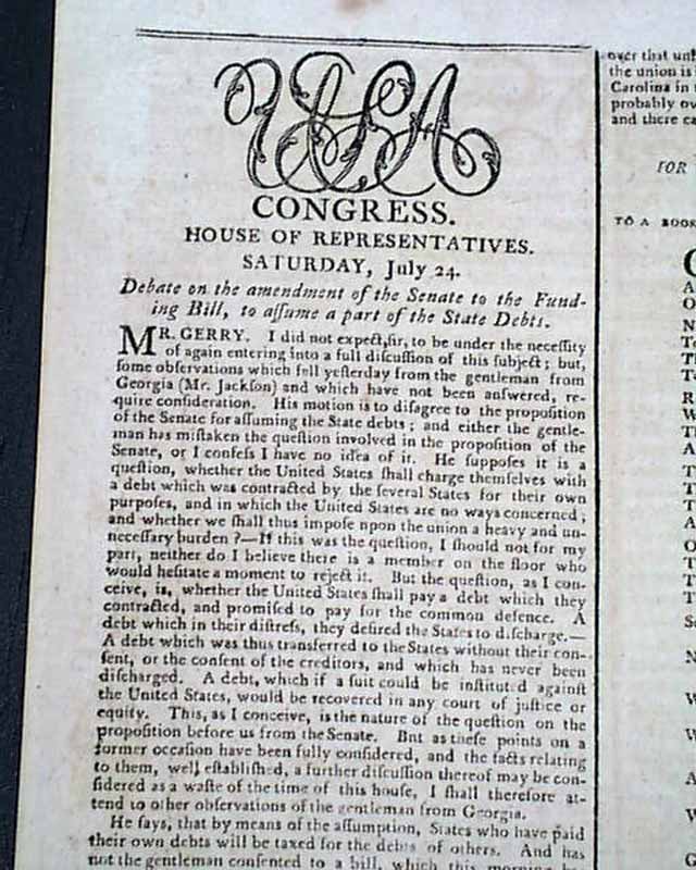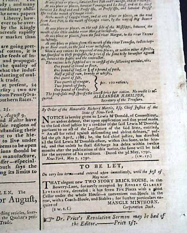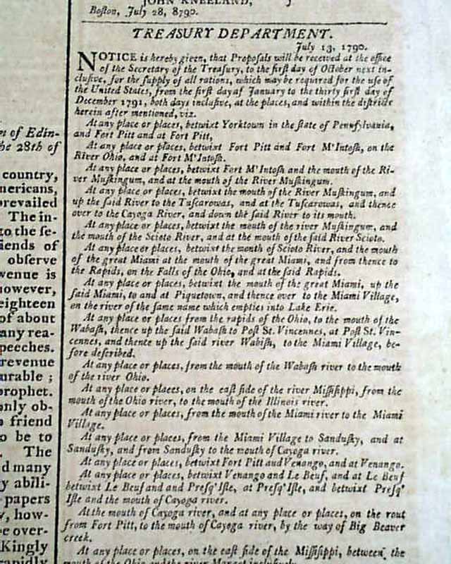 The back page has a document on seeking bids for supplying rations to the mentioned military posts headed: "Treasury Department" which is signed in type: Alexander Hamilton. Also on the back page is discussion on Hamilton's Assumption Plan, a financial strategy to consolidate state debts into a single public debt held by the federal government. The plan would be passed by Congress in 1790.