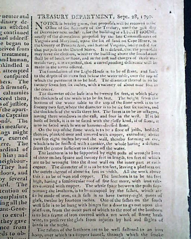 The back page has two notices from the Treasury Department, one concerning provision for the debt of the United States, and the other concerning the building of a lighthouse at Cape Henry in Virginia, with much detail as to its construction including: "The foundation of the Light House is to be of stone...the diameter of the base is to be 26 feet...The form is to be an octagon, having 3 windows in the east and 4 in the west..." with more descriptive text.