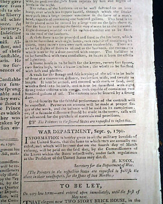 The back page also has a brief item from the "War Department" concerning a pension to injured Rev. War soldiers, signed in type: H. Knox, Sec. of War.