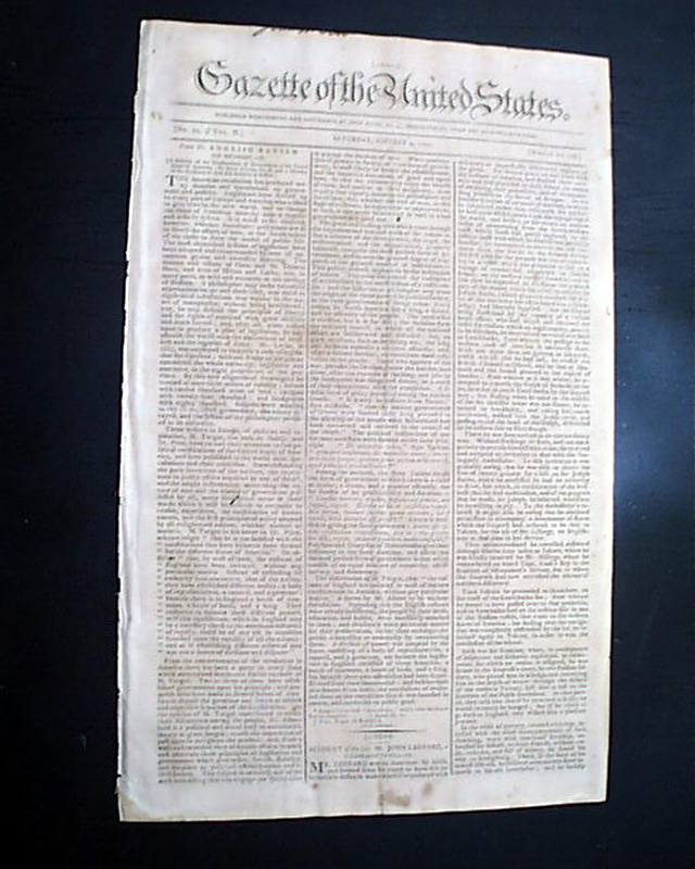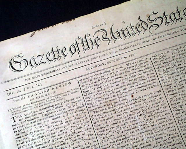 GAZETTE OF THE UNITED STATES, New York, October 9, 1790  A brief item on page 3 notes: "The Commissioners of New York and Vermont have amicably adjusted the important business of their mission; the result is that Vermont is dismembered from the state of New York...This the way is open for the admission of Vermont into the Federal Union..." which would happen in 1791. An item also notes that the population of Philadelphia is now 50,000.