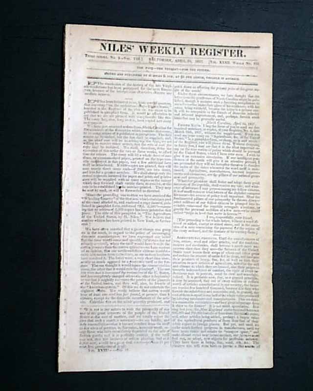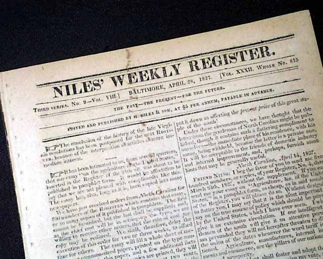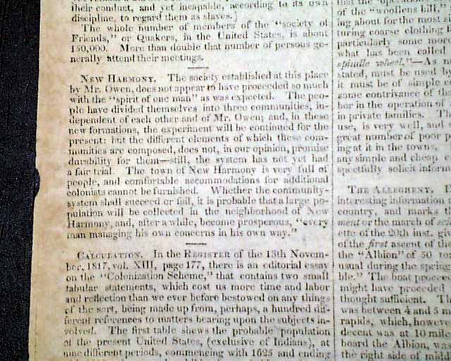 NILES' WEEKLY REGISTER, Baltimore, April 28, 1827 Page 4 has a report: "New Harmony" concerning this famous utopian community. It begins: "The society established at this place by Mr. Owen does not appear to have proceeded so much with the 'spirit of one man' as was expected..." with more.