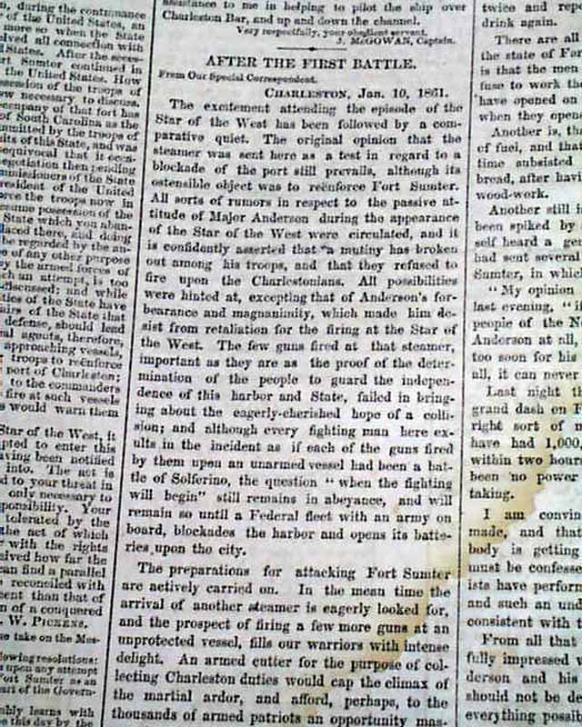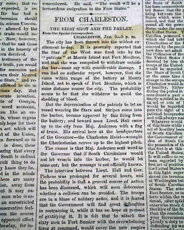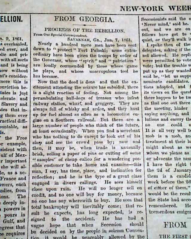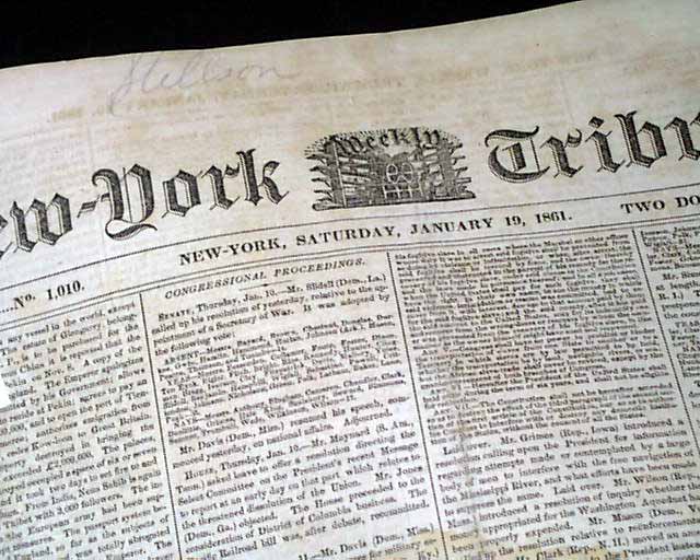 NEW YORK WEEKLY TRIBUNE, Jan. 19, 1861 A wealth of fine pre-war content in this issue as states consider seceding from the Union, including: "The Pro-Slavery Rebellion - Secession Is War" "From Georgia - Progress of the Rebellion" "From Charleston - The First Shot and the Parley" which reports on the Star of the West incident, considered by many to be the official beginning of the Civil War.