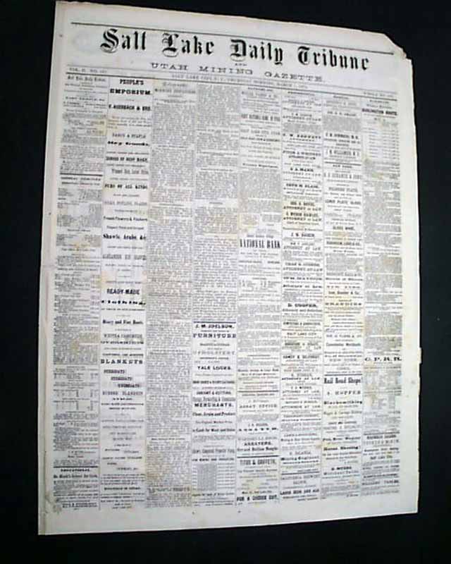 SALT LAKE DAILY TRIBUNE & UTAH MINING GAZETTE, March 7, 1872 The first 26 issues of this newspaper were titled "Mormon Tribune", followed by the "Salt Lake Tribune" then the above title from 1871.