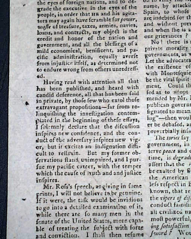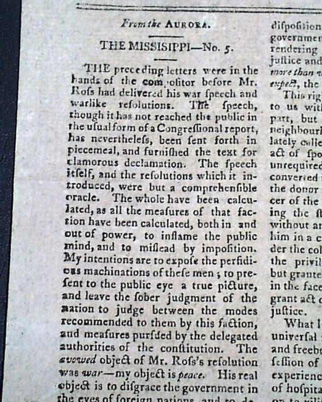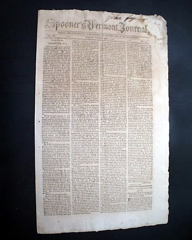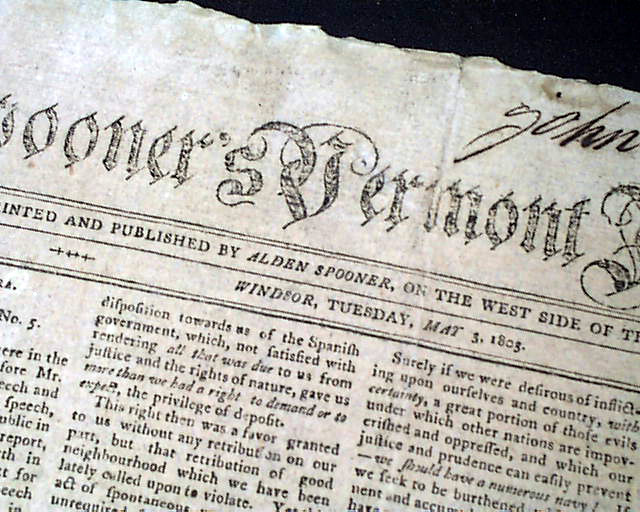 SPOONER'S VERMONT JOURNAL, Windsor, May 3, 1803  With considerations for the purchase of the Louisiana Territory from France then much in focus, it is not surprising that nearly the entire front page is taken up with the 5th in a series of 7 essays titled: "The Mississippi", dealing with this controversial topic of the day.
