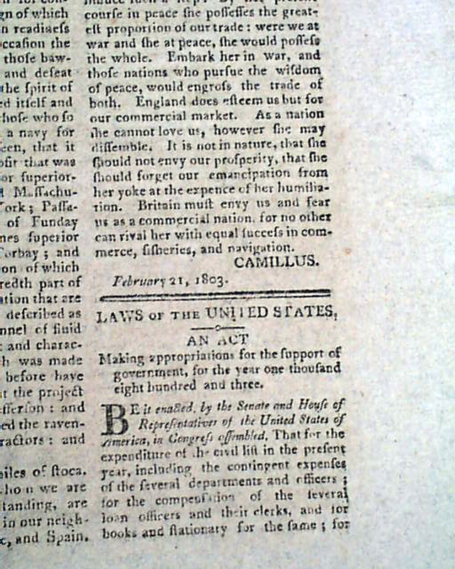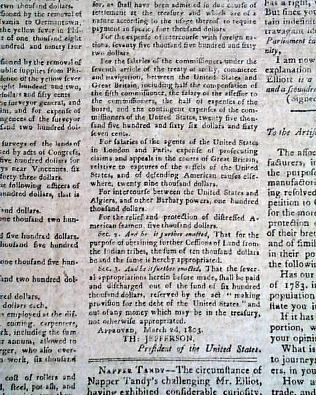 Beginning on the front page & taking most of page 2 is an Act of Congress concerning appropriations for the year 1803, signed in type: Th. Jefferson.