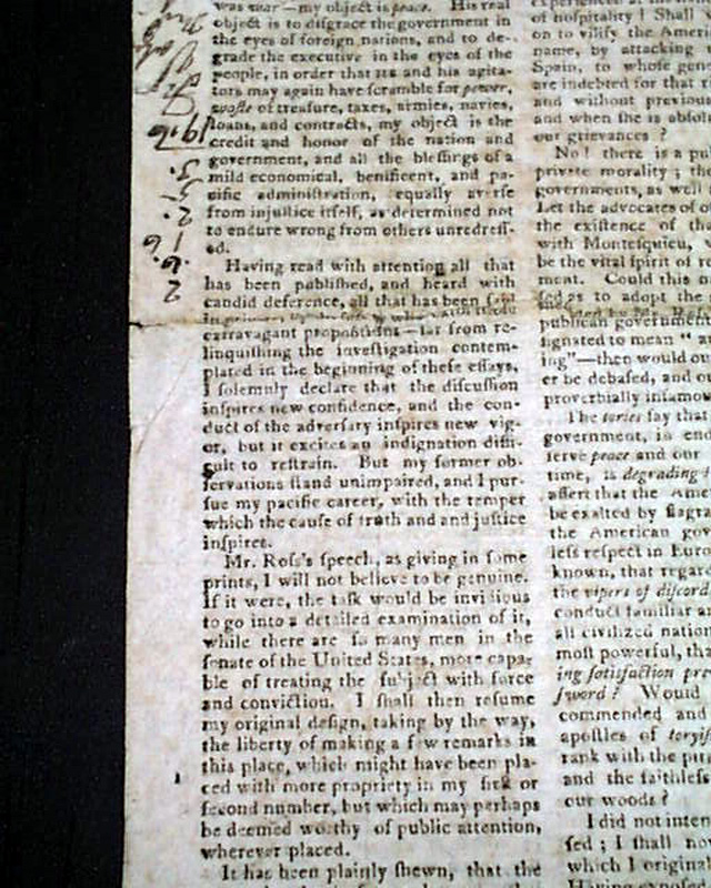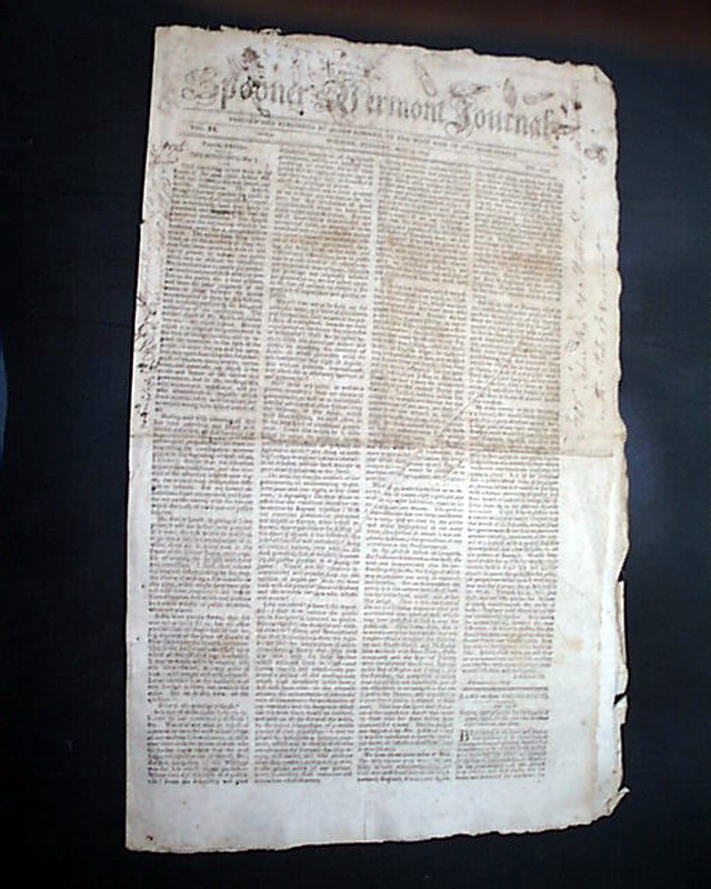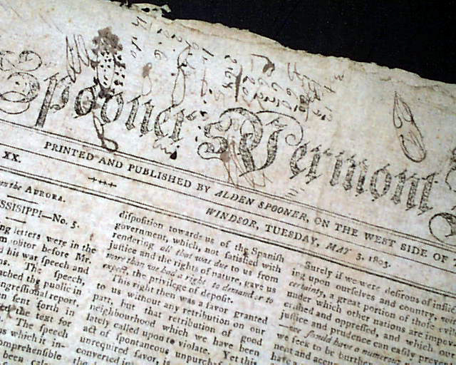 SPOONER'S VERMONT JOURNAL, Windsor, May 3, 1803  With considerations for the purchase of the Louisiana Territory from France then much in focus, it is not surprising that nearly the entire front page is taken up with the 5th in a series of 7 essays titled: "The Mississippi", dealing with this controversial topic of the day.