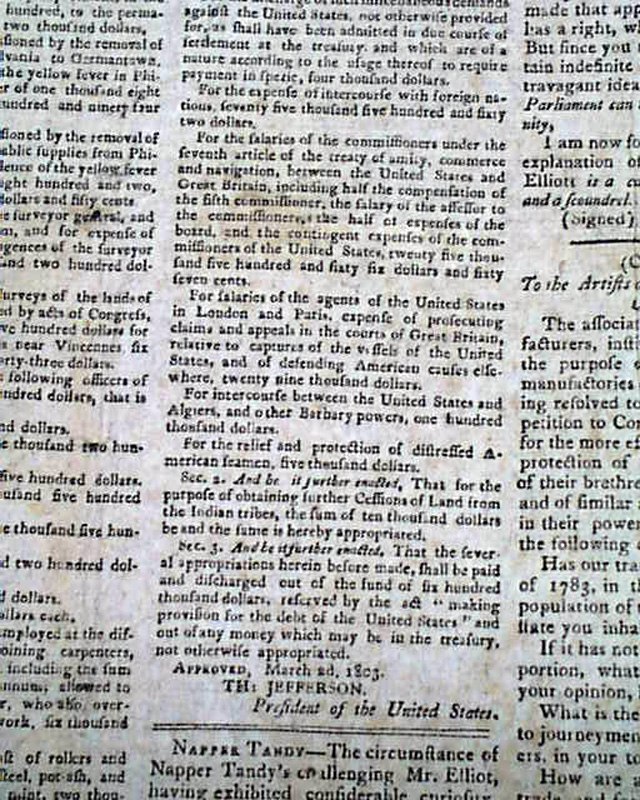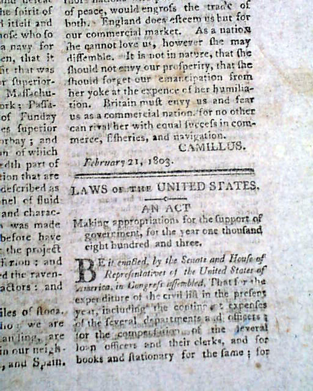 Beginning on the front page & taking most of page 2 is an Act of Congress concerning appropriations for the year 1803, signed in type: Th. Jefferson.