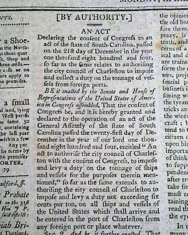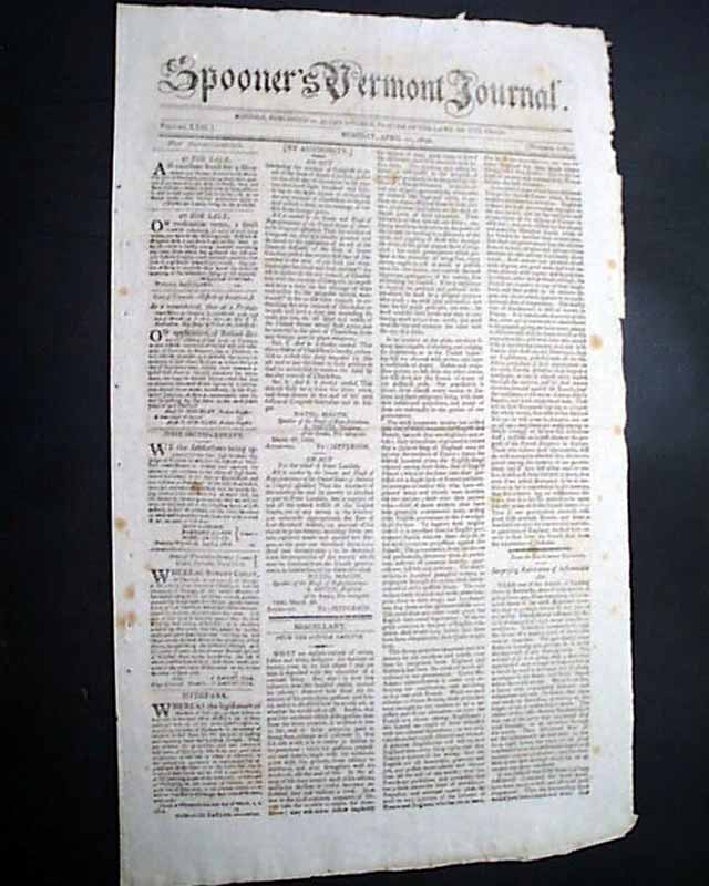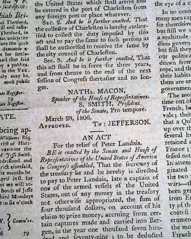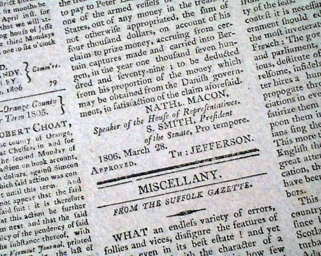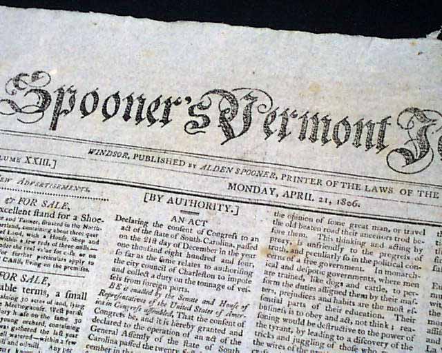 SPOONER'S VERMONT JOURNAL, Windsor, April 21, 1806 The front page has two Acts of Congress, each signed in type by the President: Th. Jefferson.
