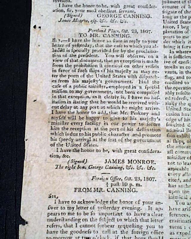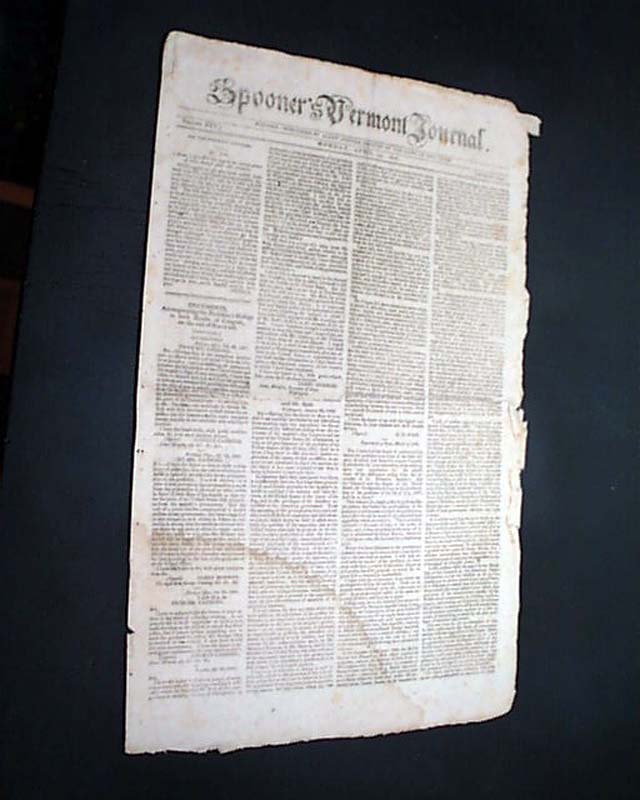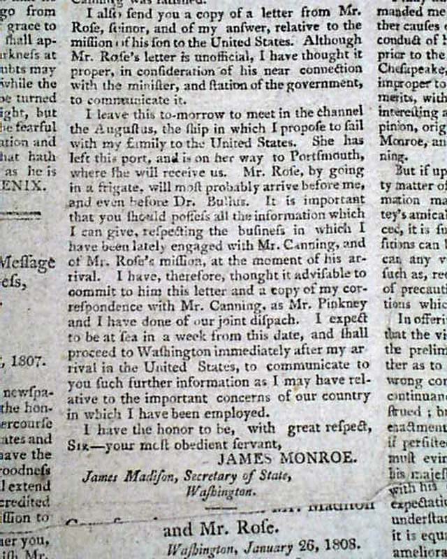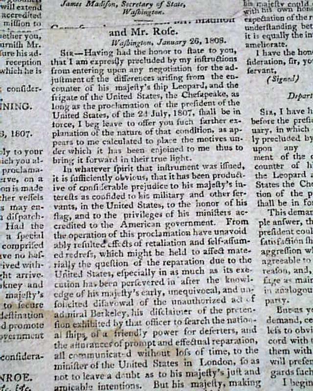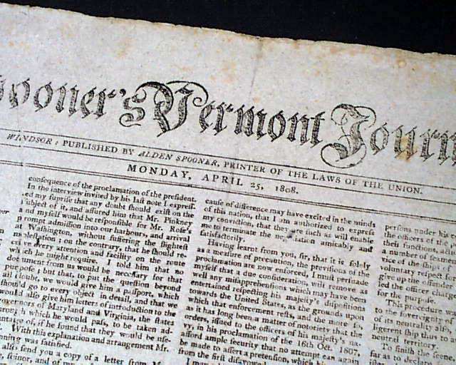 SPOONER'S VERMONT JOURNAL, Windsor, April 25, 1808 Both pages 1 and 2 have much on: "Documents Accompanying the President's Message to Both Houses of Congress" including two documents signed by James Monroe, and one by James Madison.