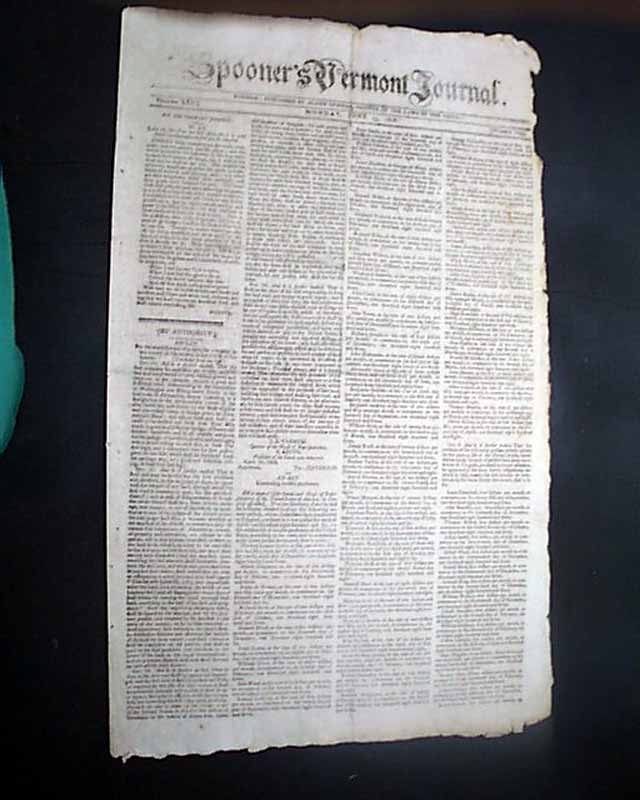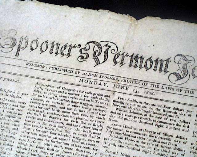 SPOONER'S VERMONT JOURNAL, Windsor, June 13, 1808 The front page has "AN ACT" of congress: "For the establishment of a turnpike company in the county of Alexandria in the district of Columbia" signed tintype: Th. Jefferson. The balance of the front page is "AN ACT Concerning Invalid Pensions" with a very lengthy list of recipients and their amounts, signed on page 2: Th. Jefferson.