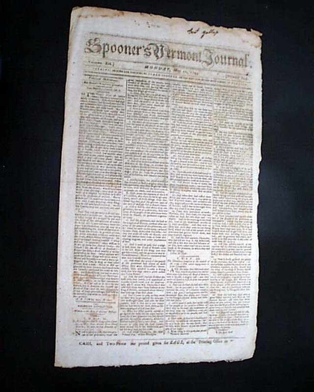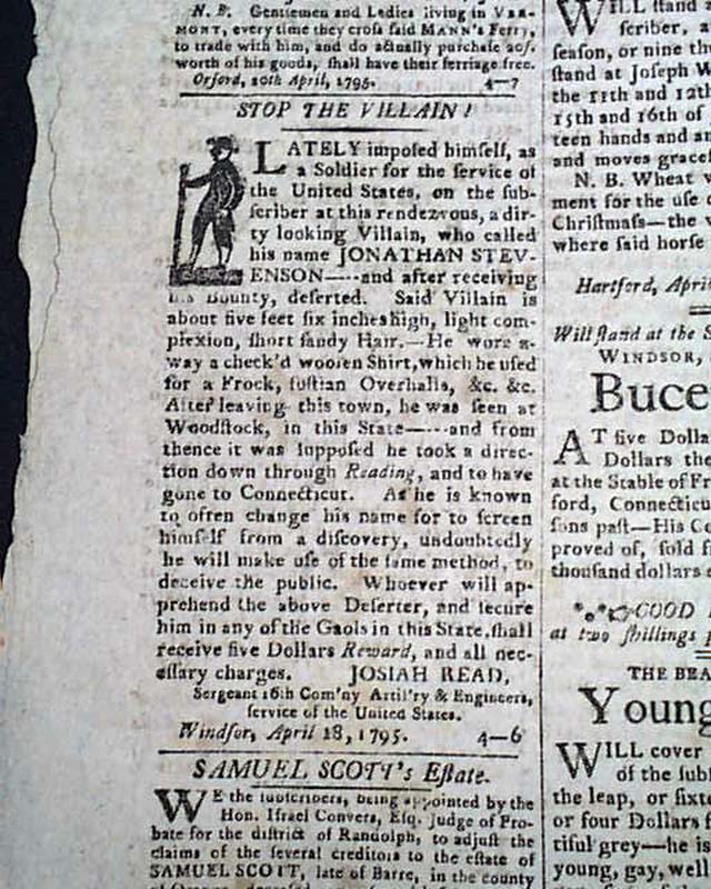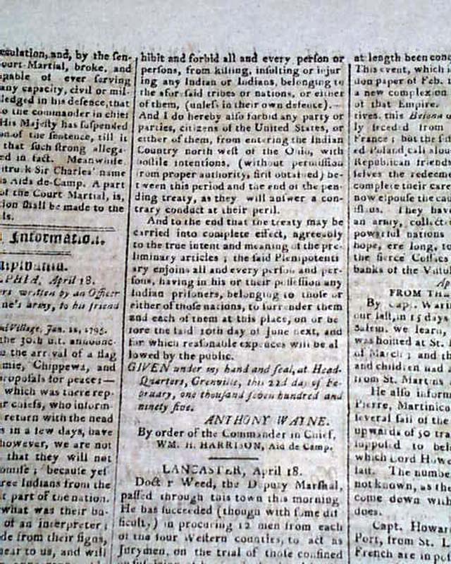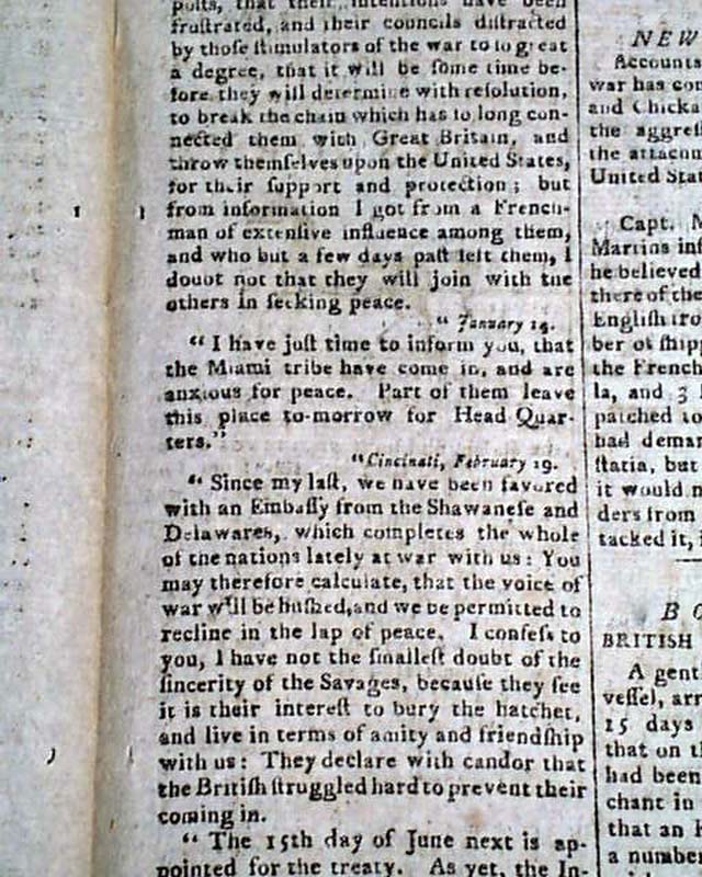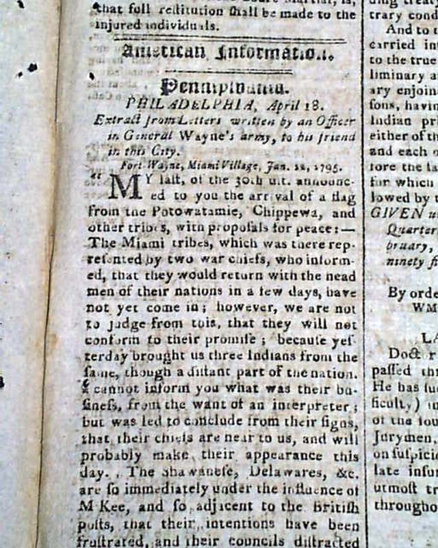 SPOONER'S VERMONT JOURNAL, Windsor, May 11, 1795 Page 3 has a letter from an officer in General Anthony Wayne's army, datelined from Fort Wayne, Miami Village, in which he gives the latest on relations with the Indians in what is now the Ohio vicinity.