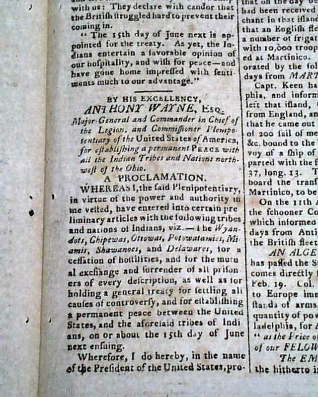 Also on page 2 is: "A Proclamation" for establishing a permanent peace with all the Indian tribes and nations northwest of the Ohio River, signed in type: Anthony Wayne.