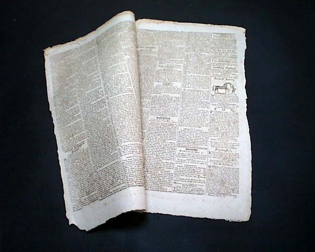 Four pages, never-trimmed margins, minor damp stains at the top margin, very nice condition.