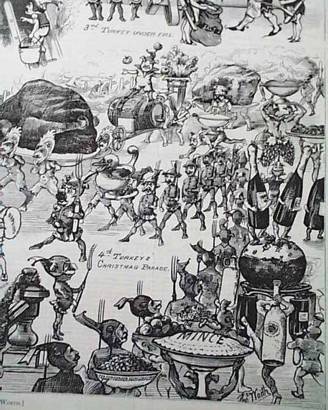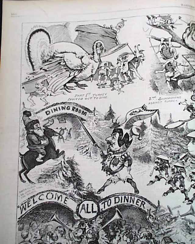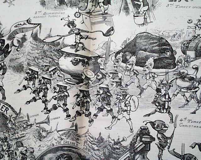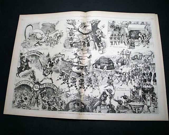 The great, tipped-in doublepage centerfold is: A Dream of a Christmas Dinner in Five Parts". Also inside is a poem with illus: "The Christmas Baby".
