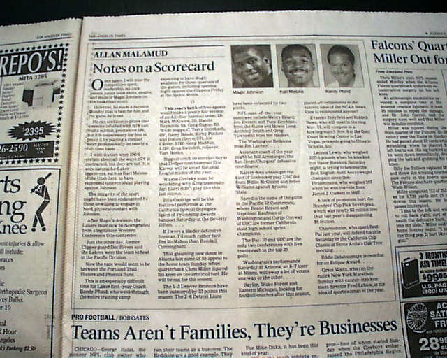 The front page of this section has a few reports concerning the announcement by Magic Johnson with headings that include: "Peer Pressure Might Has Effect" and color photo. Much more inside. See images for portion of the text. Great to have in this L.A. publication.