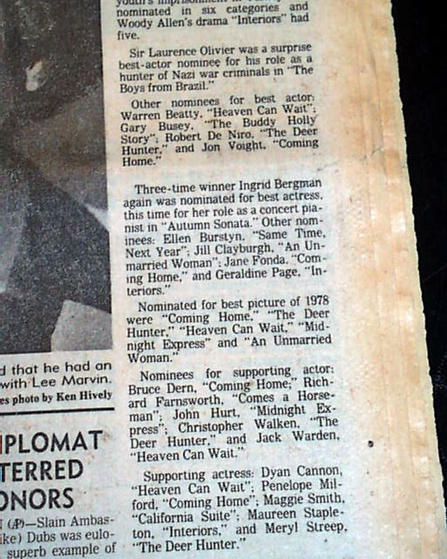 The front page has a banner heading: "Oscar Derby Tie" with lead-in: "18 Nominations For 2 Films" and subhead. (see images) Photos of winning actors/actresses are on page 3.