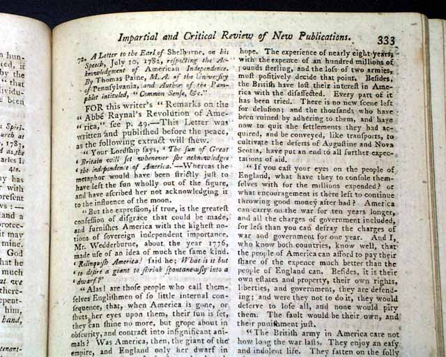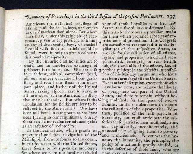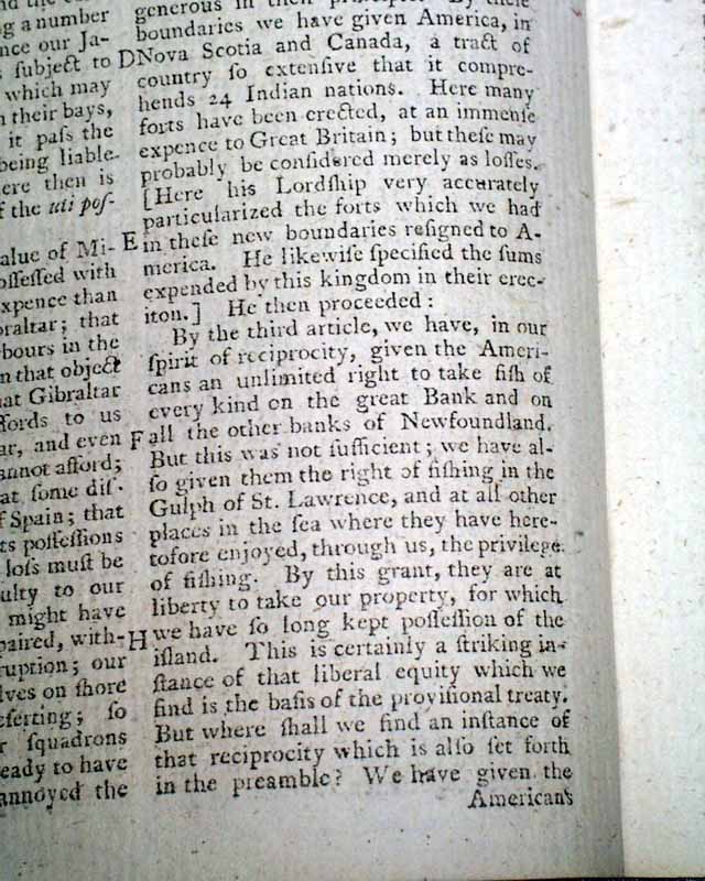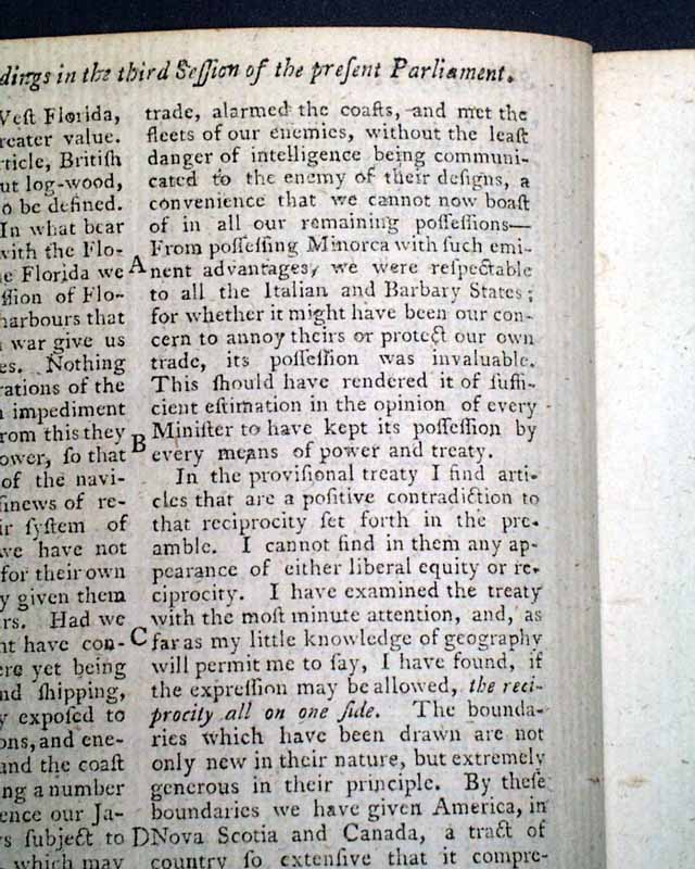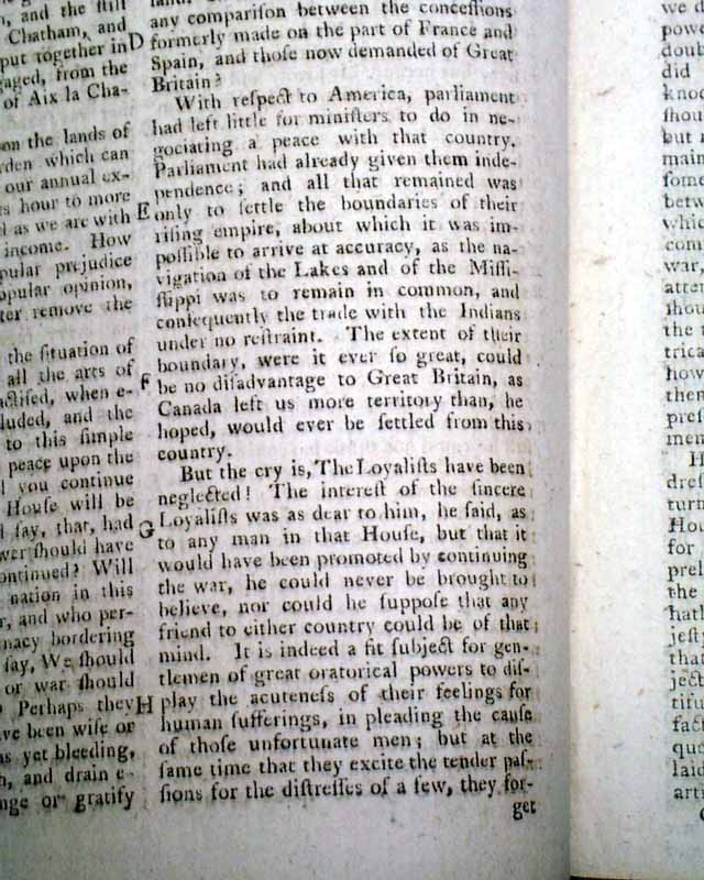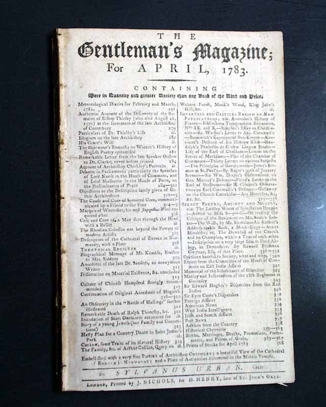 Item # 713571 GENTLEMAN'S MAGAZINE, London, April, 1783  Eighteen pages are taken up with "Summary of Proceedings in the 3rd Session of the Present Parliament" which include  discussion on concluding events with the war in America, including: "...With respect to America, parliament had left little for ministers to do in negociating a peace with that country..." and further on is more detailed discussion of the provisional treaty of peace for ending the Revolutionary War.