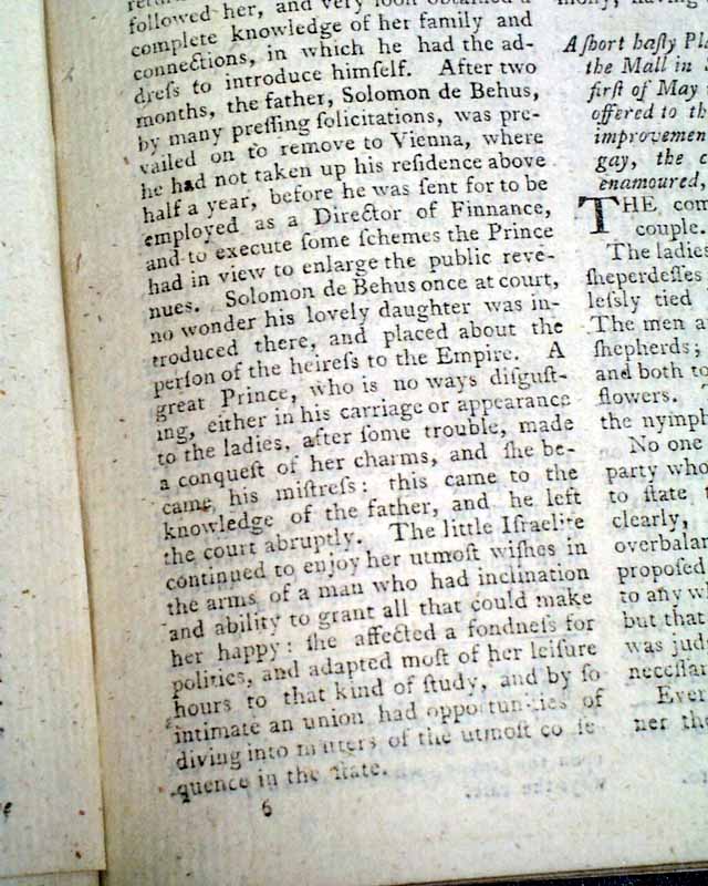 A full page plate of the Cathedral of Eveaux in Normandy is accompanied by a descriptive article. Another article: "The Story of a Young Jewess, lately Banished (from) the Imperial Dominions in Germany" & more.
