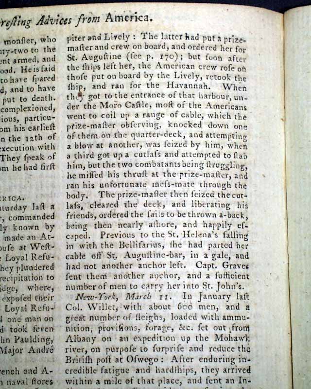 Near the back is a letter from Earl Cornwallis to Henry Clinton concerning thoughts on the closing battles of the war in the Southern colonies. Also: "Advices From America", with mentions John Andre and one his captors, and which takes nearly a full page with some war-related reports and other items.