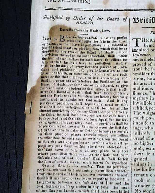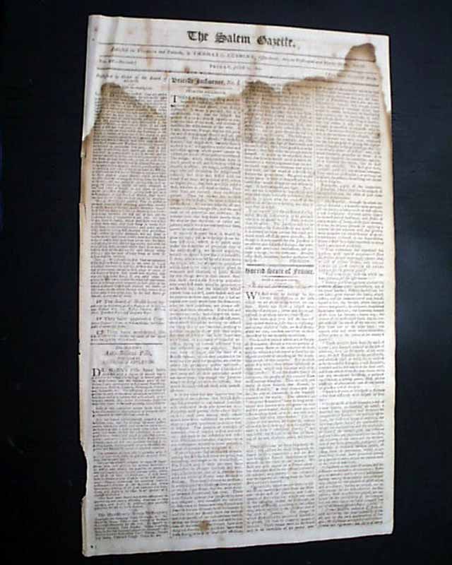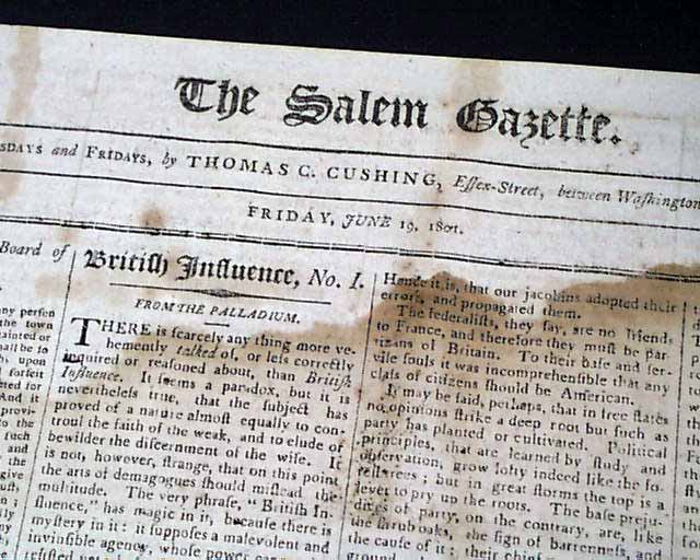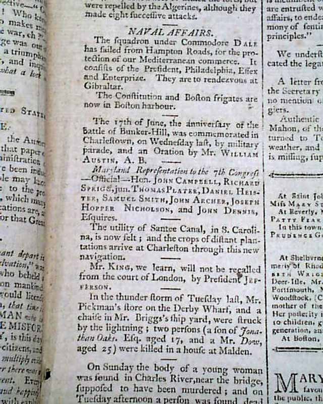 SALEM GAZETTE, Massachusetts, June 19, 1801 On page 3 under "Naval Affairs" is a brief report stating: "The Constitution and Boston frigates are now in Boston Harbor." Also mention of ships headed off: "...for the protection of our Mediterranean commerce..." leading to the First Barbary War.