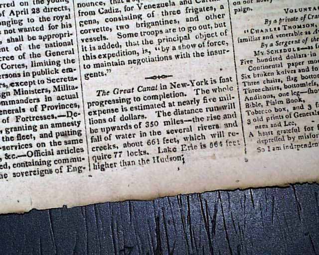 MASSACHUSETTS SPY, OR WORCESTER GAZETTE, July 12, 1820 A page 2 report notes: "The Great Canal in New-York is fast progressing...The whole expense is estimated at nearly five million dollars. The distance will be upwards of 350 miles--the rise and fall of water in the...rivers and creeks, about 661 feet...will require 77 locks. Lake Erie is 564 feet higher than the Hudson."
