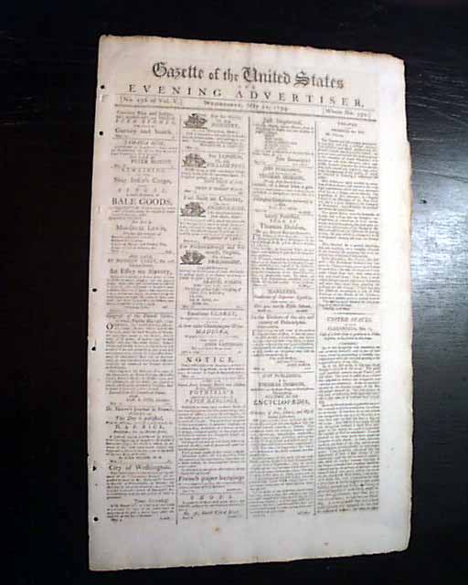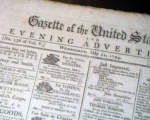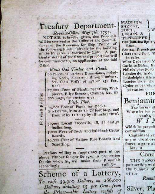 GAZETTE OF THE UNITED STATES, Philadelphia, May 21, 1794 Shortly before this date the federal government passed the historic Naval Act of 1794, authorizing the building of six frigates, the founding ships of what would become the U.S. Navy.