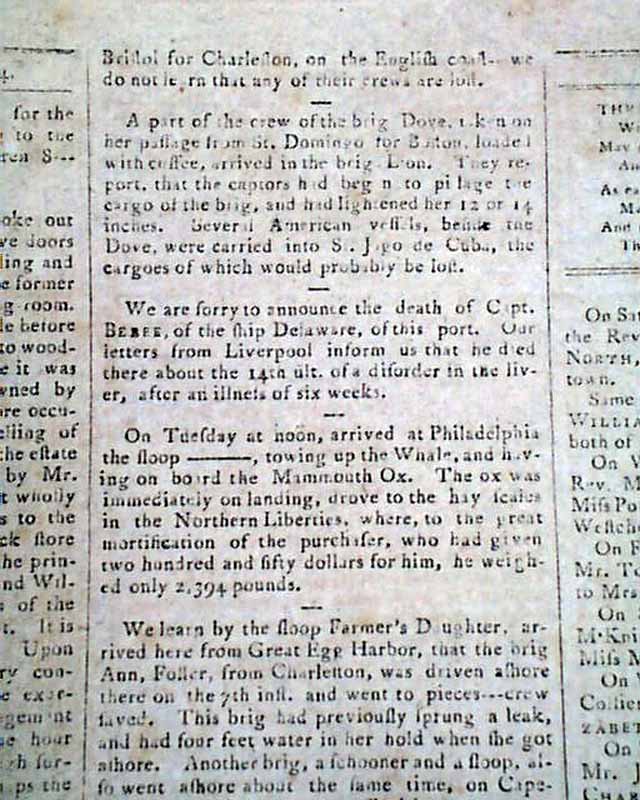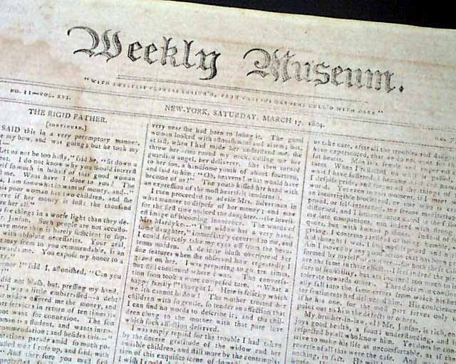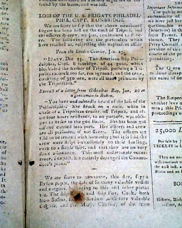 WEEKLY MUSEUM, New York, March 17, 1804 Page 3 has an historic report: "Loss Of The U.S. Frigate Philadelphia, Capt. Bainbridge". The report begins: "We are sorry to say that the above-mentioned frigate has been lost on the coast of Tripoli & the officers & crew, we fear, condemned to slavery..." and what followed are additional naval reports.