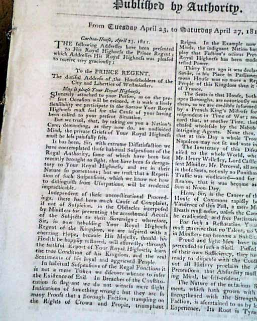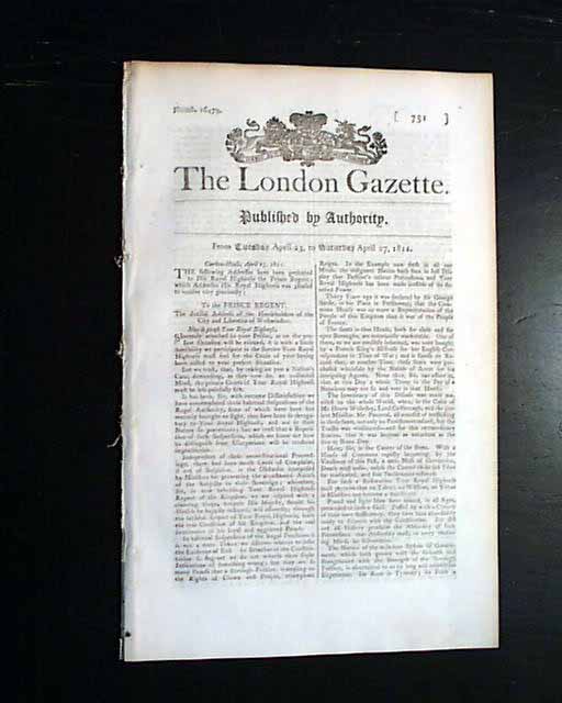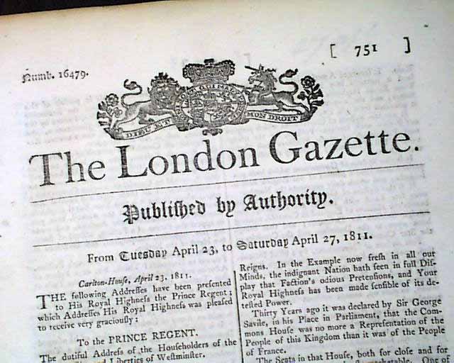 THE LONDON GAZETTE, England, April 27, 1811 During the latter years of his reign, King George III was declared mentally incapable of carrying on his duties. Thus, the "Care of the King During his Illness Act" of 1811 came into play, giving his son, the Prince Regent and the future King George IV, the authority to act in his father's behalf.