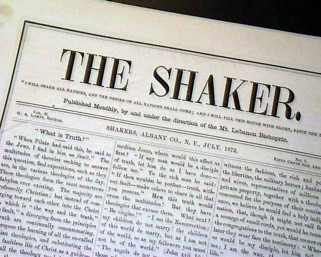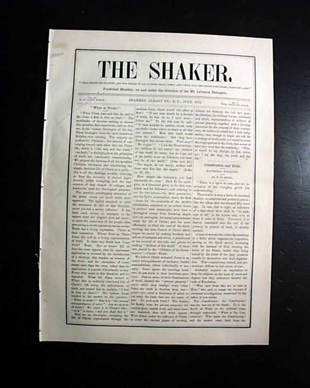 Item # 713647 THE SHAKER, Shakers, New York, and Shaker Village, New Hampshire, July, 1872 A monthly publication "Published By The United Societies" for folks in the Shaker community, quite famous today for the style of furniture they produced.