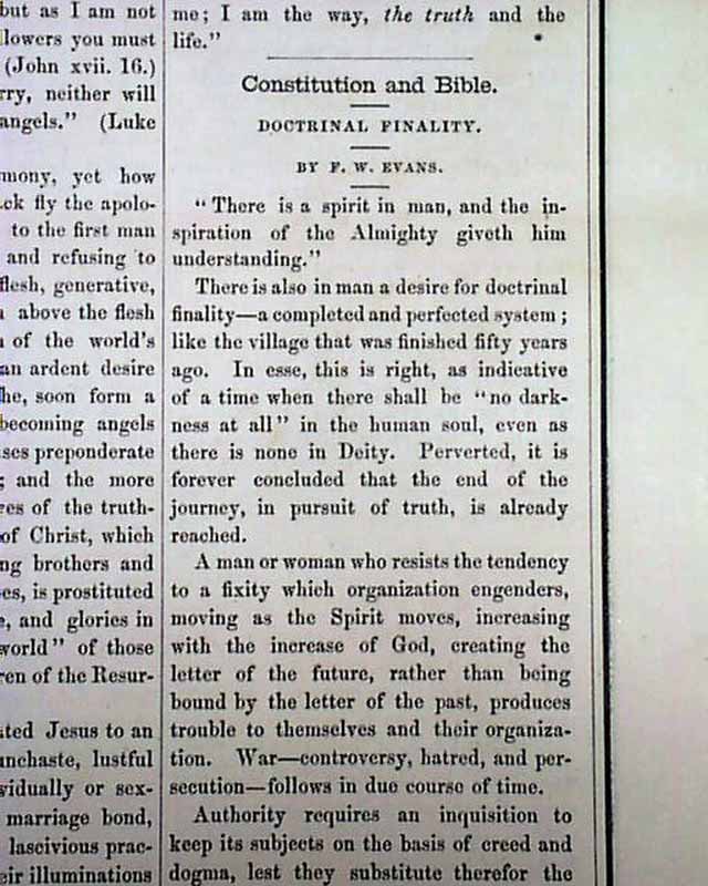This issue has much religious-related content including "What is Truth? "Constitution & Bible" "Woman's Rights" "Have the Shakers Made a Mistake? "True Shaker Discipline" and so much more.