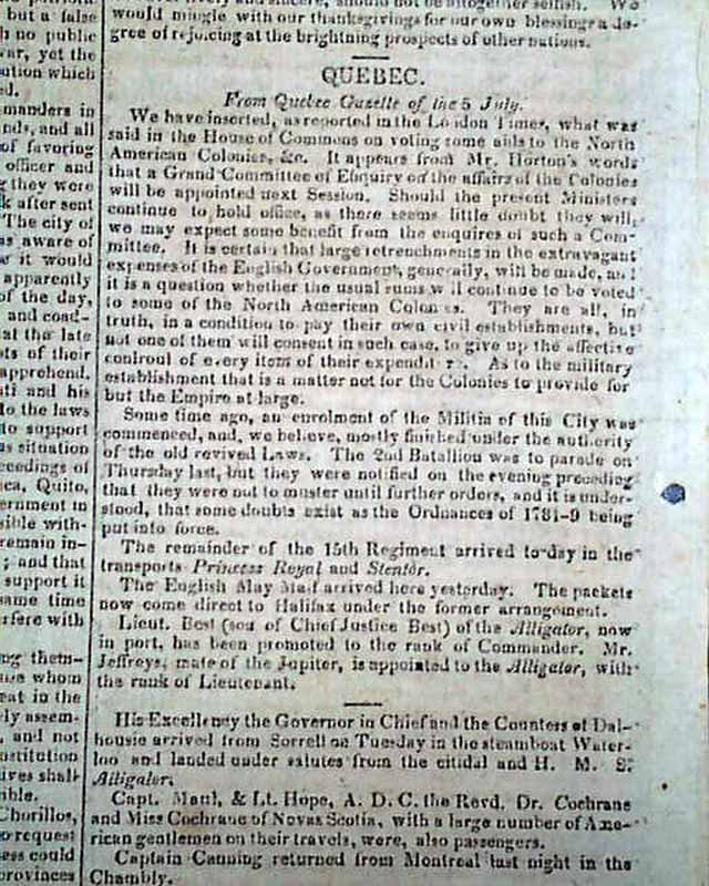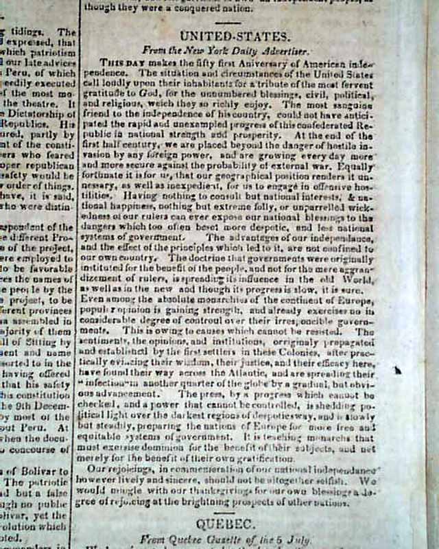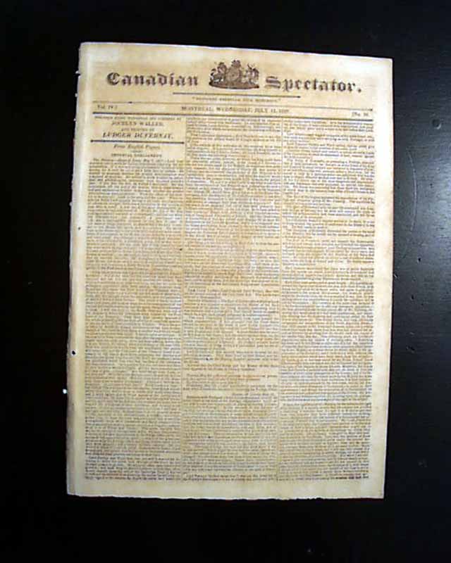 THE CANADIAN SPECTATOR, Montreal, July 11, 1827 A very early Montreal newspaper as we rarely receive such from the 1820's. Page 2 has: "South America" "United States" which begins: "This day makes the fifty first Anniversary of American independence..." with more; "Quebec" which takes nearly a full page.