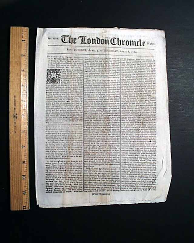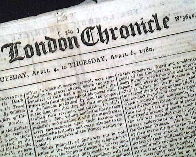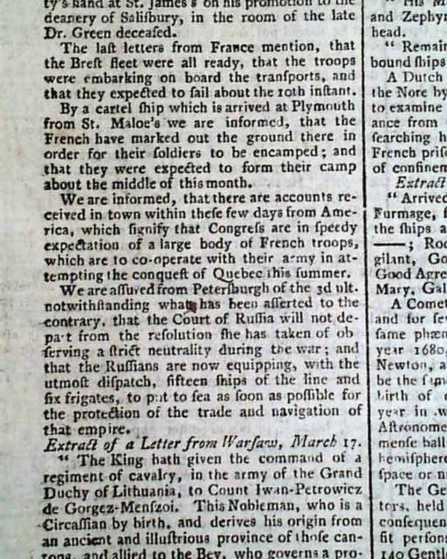 THE LONDON CHRONICLE, England, April 6, 1780  The back page has a report which notes: "We are informed that there are accounts received in town within these few days from America which signify that Congress are in speedy expectation of a large body of French troops which are to co-operate with their army in attempting the conquest of Quebec this summer."