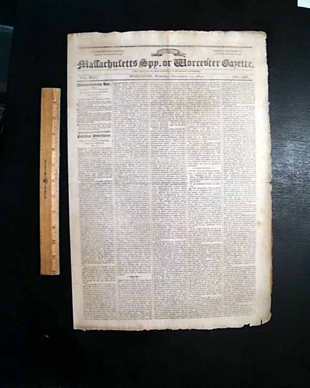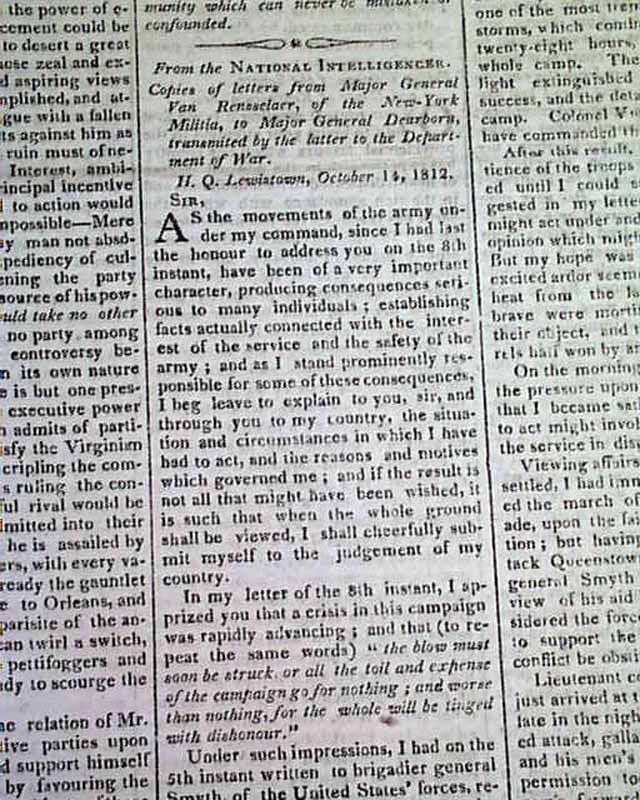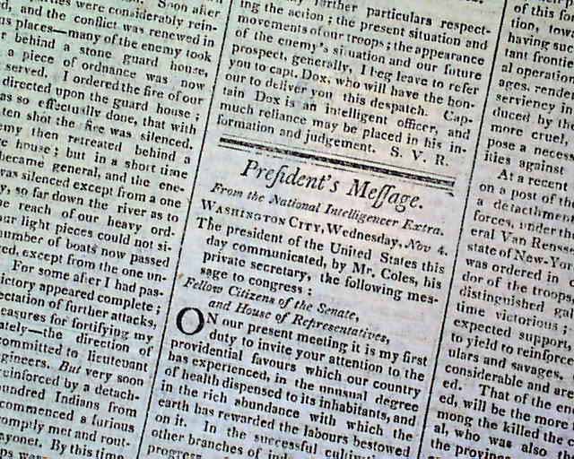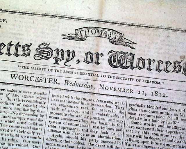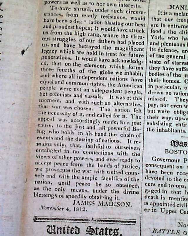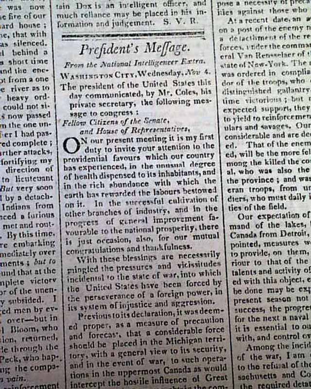 THOMAS'S MASSACHUSETTS SPY OR WORCESTER GAZETTE, Nov. 11, 1812  Over 1 1/2 columns on the front page contain: "Copies of Letters from Major General Van Rennselaer...to Major General Dearborn...". Over half of page 2 (and a bit of pg. 3) are taken up with the "President's Message" to Congress in which he reports much on the War of 1812. It is signed in type: James Madison.