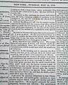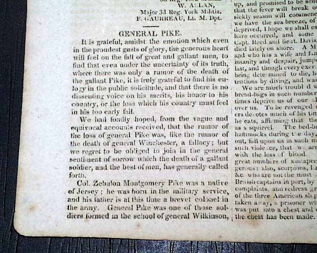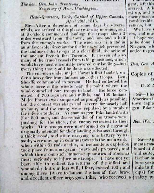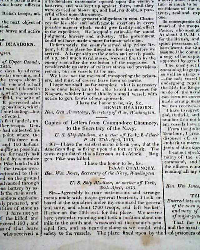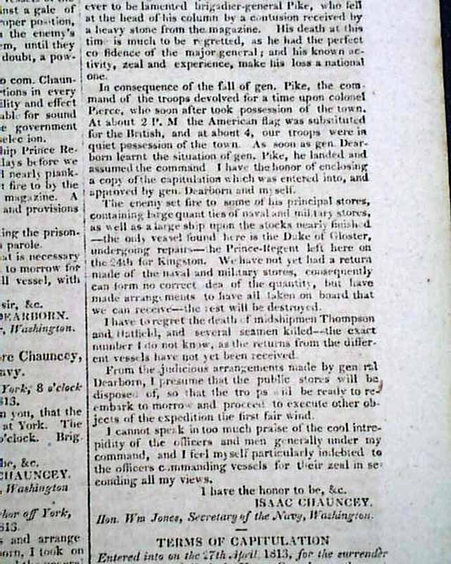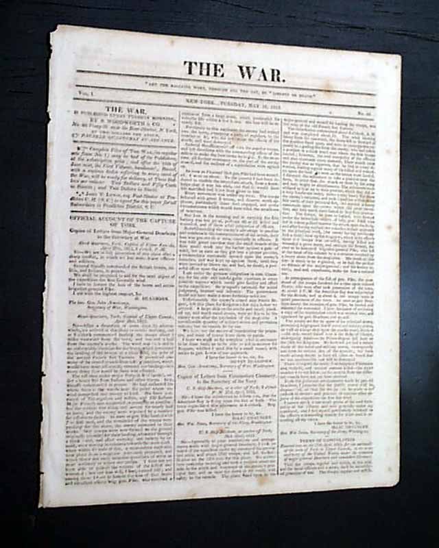 THE WAR, New York, May 18, 1813  The entire front page, and part of page 2, are taken up with documents headed: "Official Account of The Capture of York" which includes a prefacing document signed: H. Dearborn, plus a more detailed letter from York, signed: Henry Dearborn, and a lengthy letter from the U.S. ship Madison at York, signed: Isaac Chauncey, followed by the: "Terms of Capitulation" which carry over to page 2. This is followed by: "General Pike" which deals with his death.