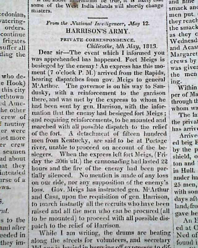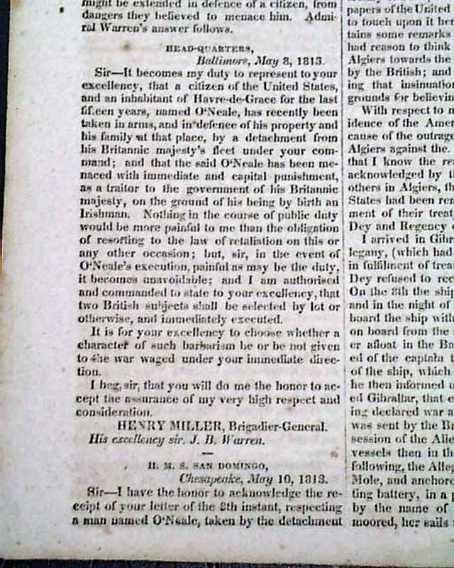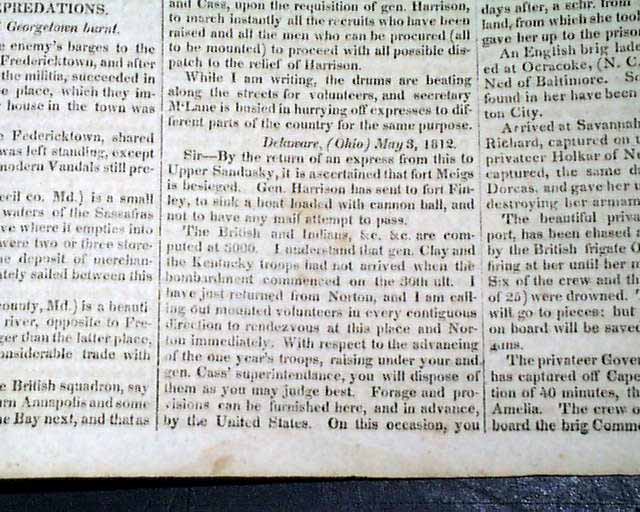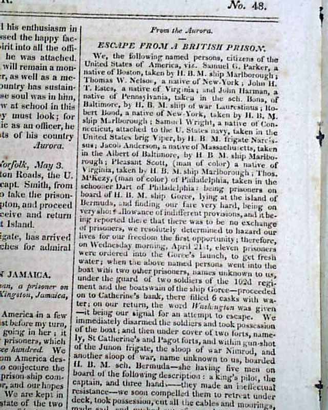 Elsewhere in the issue are: "American Prisoners in Jamaica' "British Deserters" "Further Depredations--Fredericktown & Georgetown Burnt" "Harrison's Army" "Escape from a British Prison" and even more.