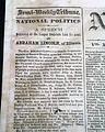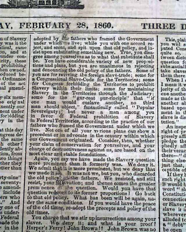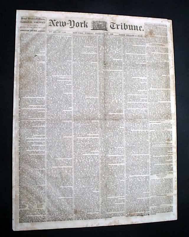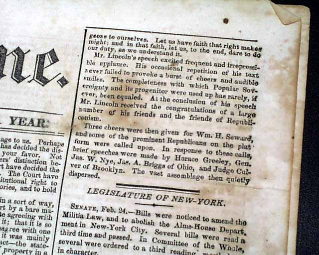 NEW YORK SEMI-WEEKLY TRIBUNE, Feb. 28, 1860  The front page has over five columns devoted to coverage of this famous speech which is headed: "NATIONAL POLITICS" "A Speech Delivered at the Cooper Institute Last Evening, by Abraham Lincoln, of Illinois".