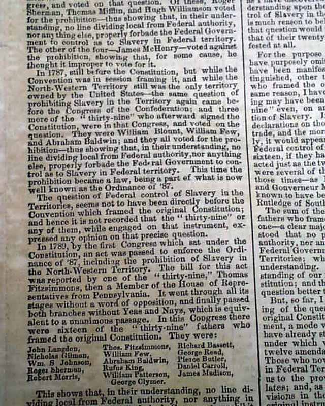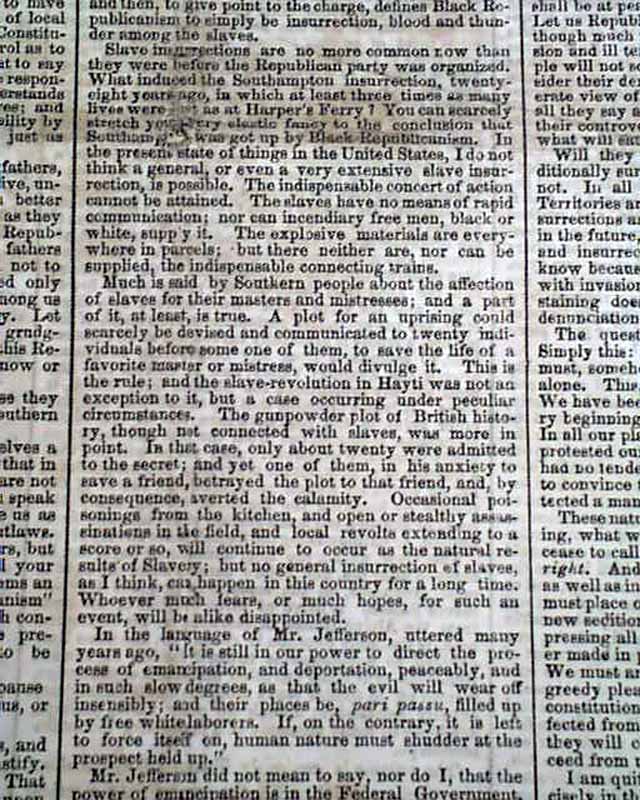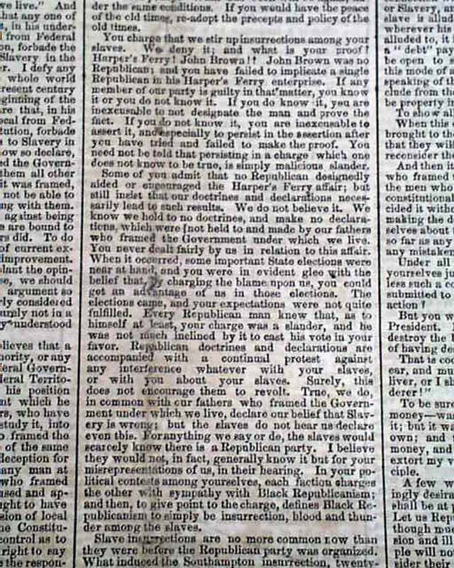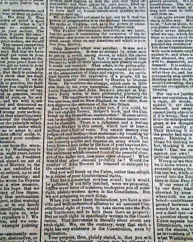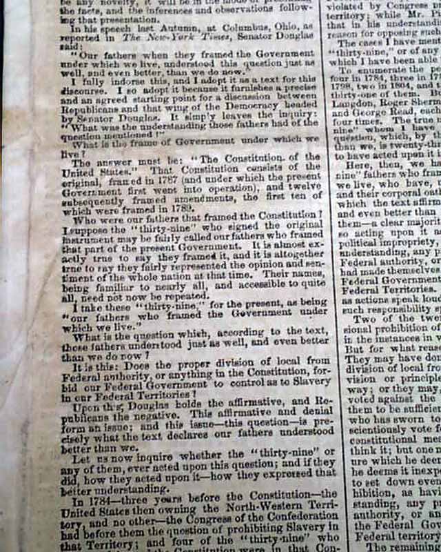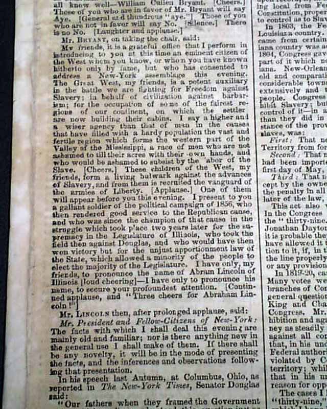 This issue not only gives the complete, lengthy text of this significant speech but has prefacing comments & also reports on the events following Lincoln completing his speech, which notes: "...Mr. Lincoln's speech excited frequent & irrepressible applause. His occasional repetition of his text never failed to provoke a burst of cheers & audible smiles..." with more.