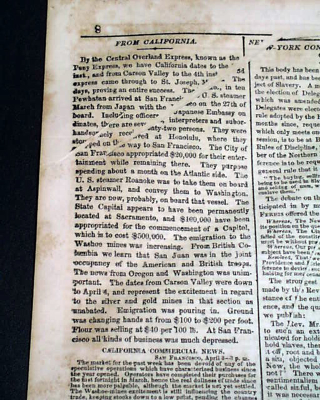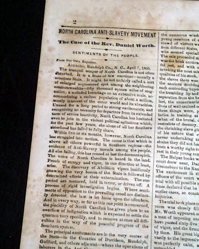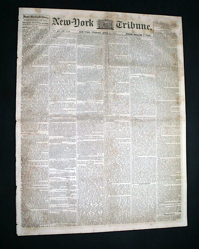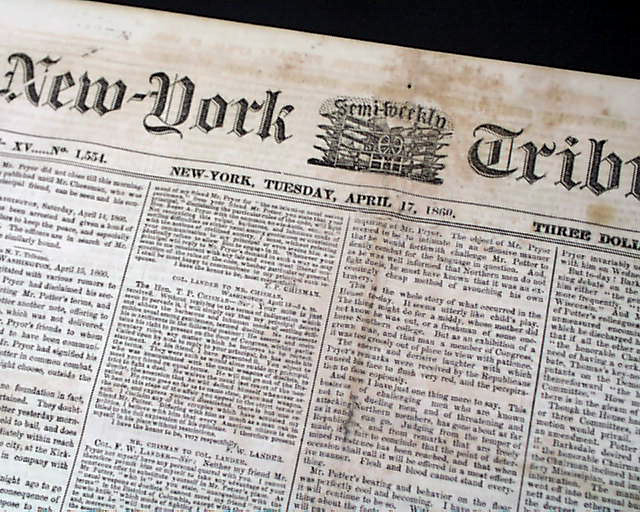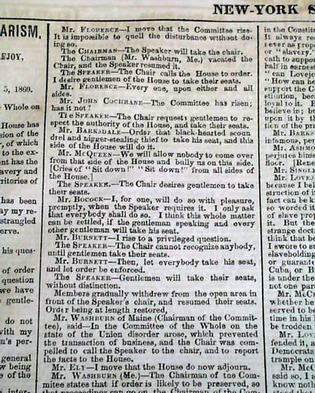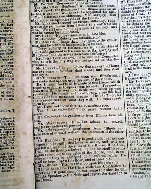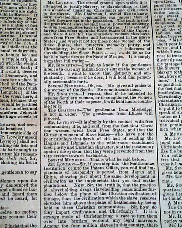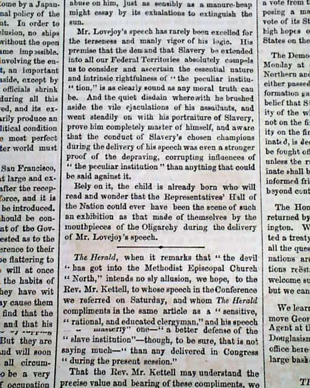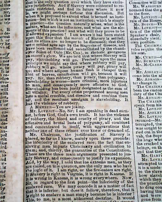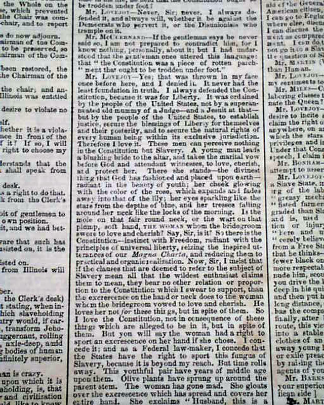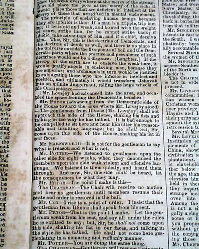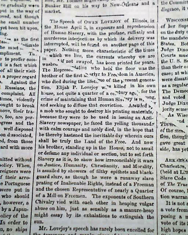 NEW YORK SEMI-WEEKLY TRIBUNE, April 17, 1860 Page 4 has a report beginning: "The speech of Owen Lovejoy of Illinois...in exposure and reprehension of human slavery, with the profane, ruffianly & murderous interjections by which its delivery was interrupted, will be found on another page..." with much more editorial commentary.
