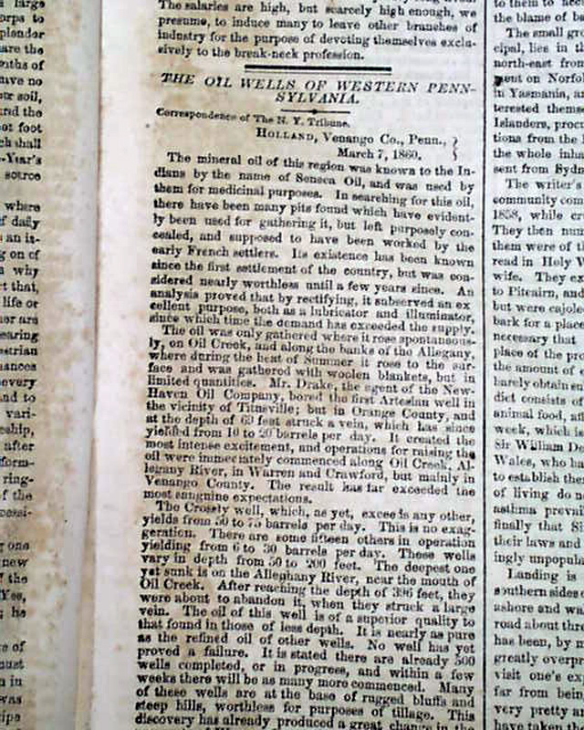 Although in America, Texas might be best associated with the oil industry, it was the little town of Titusville, Pennsylvania, where the oil boom had its origins in August, 1859. Page 3 has a report headed: "The Oil Wells of Western Pennsylvania".
